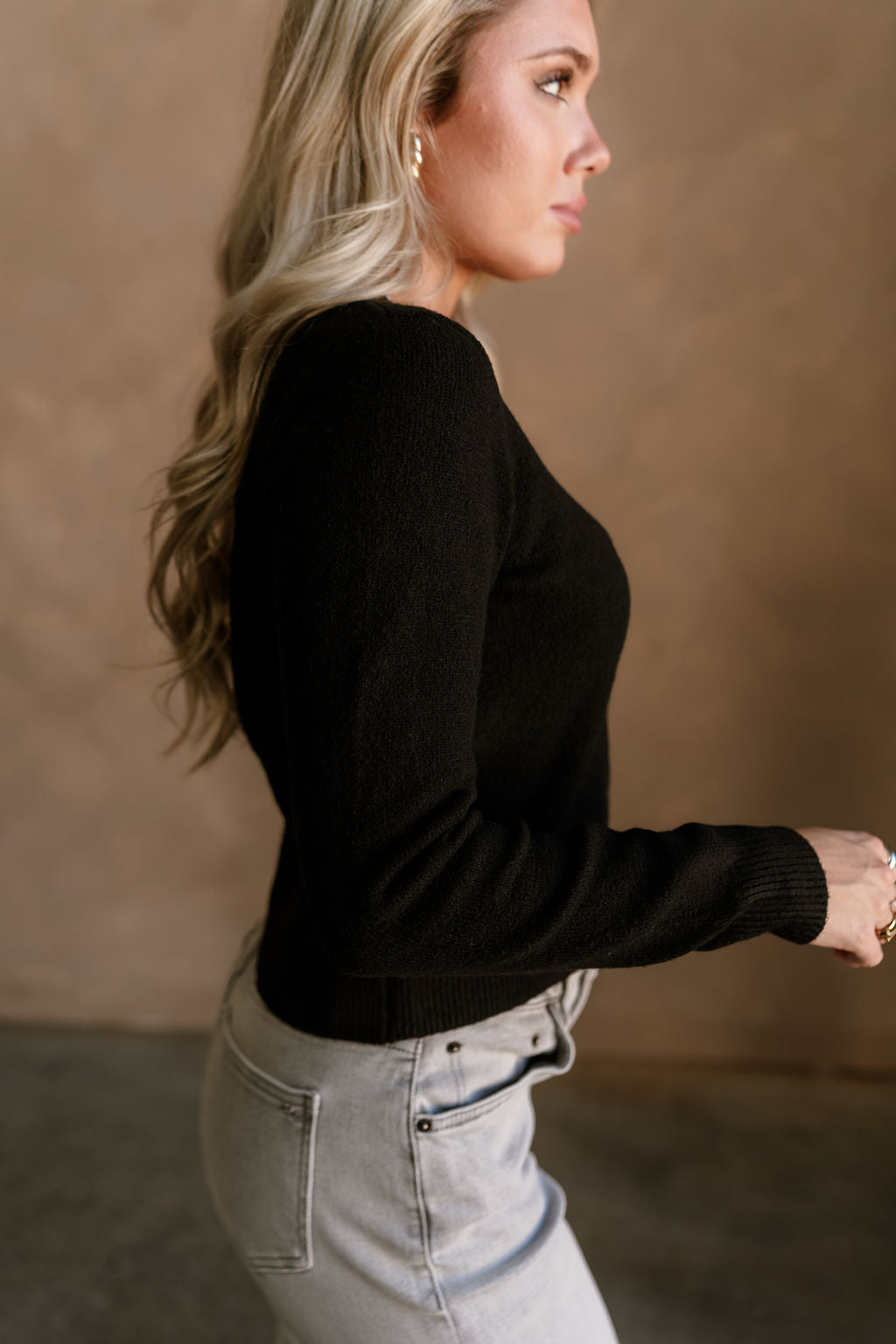 Long sleeves and a ribbed hem give this piece a flattering, cozy fit that stays in place throughout the day. The rich black color adds versatility, making it simple to pair with denim, trousers, skirts, or printed tops. Whether you're layering for the office, weekend errands, or a chilly evening out, this cardigan delivers dependable style with ease.