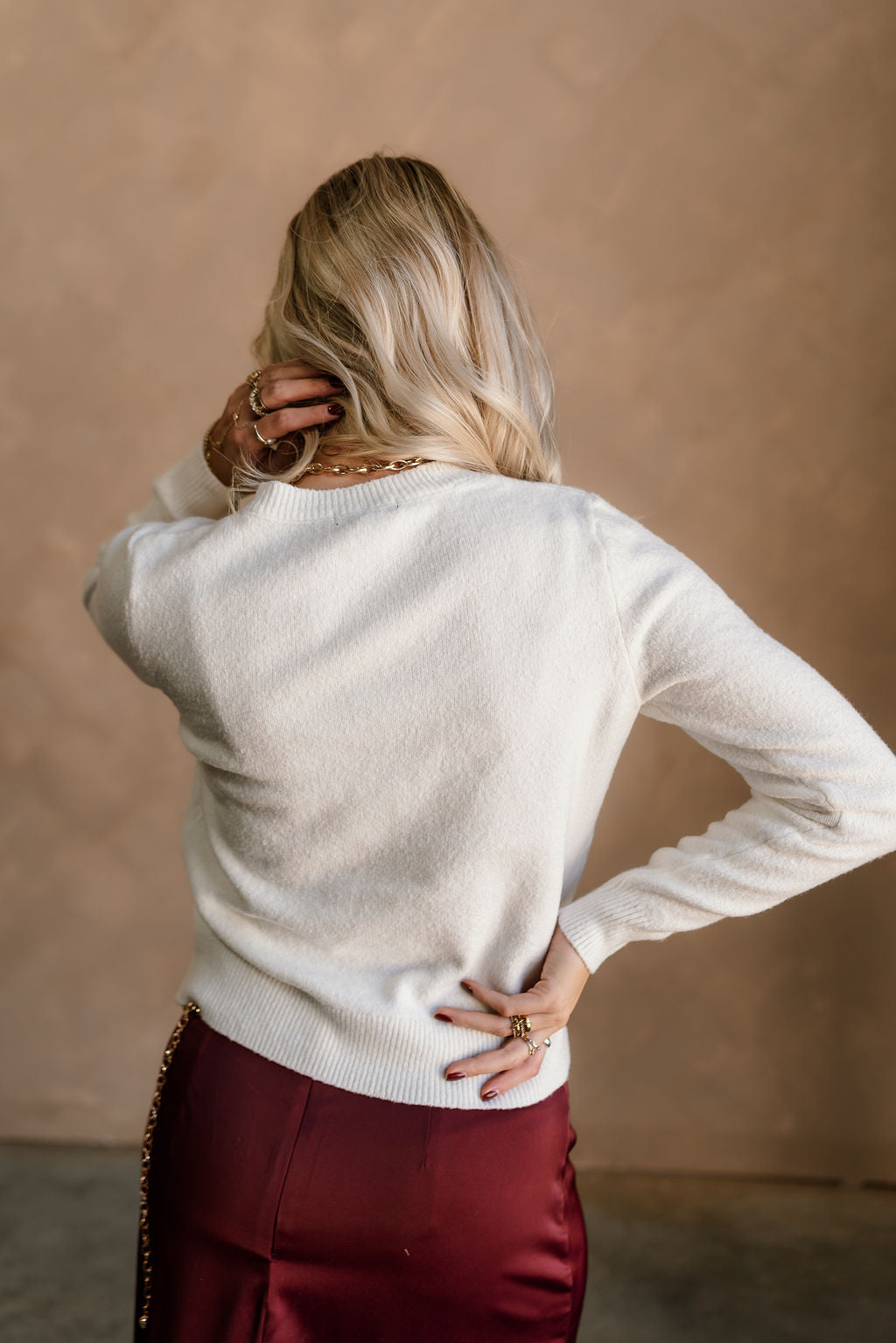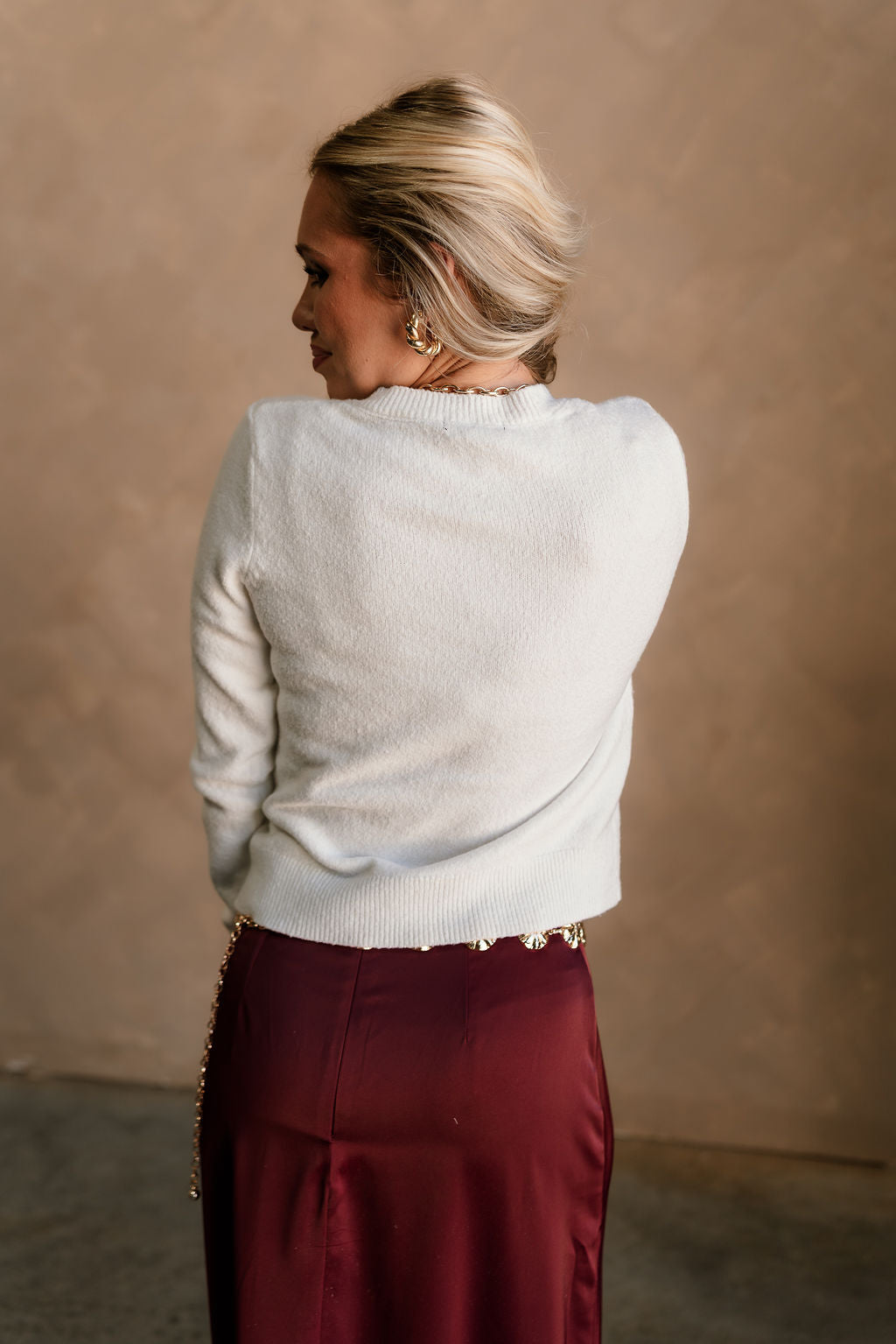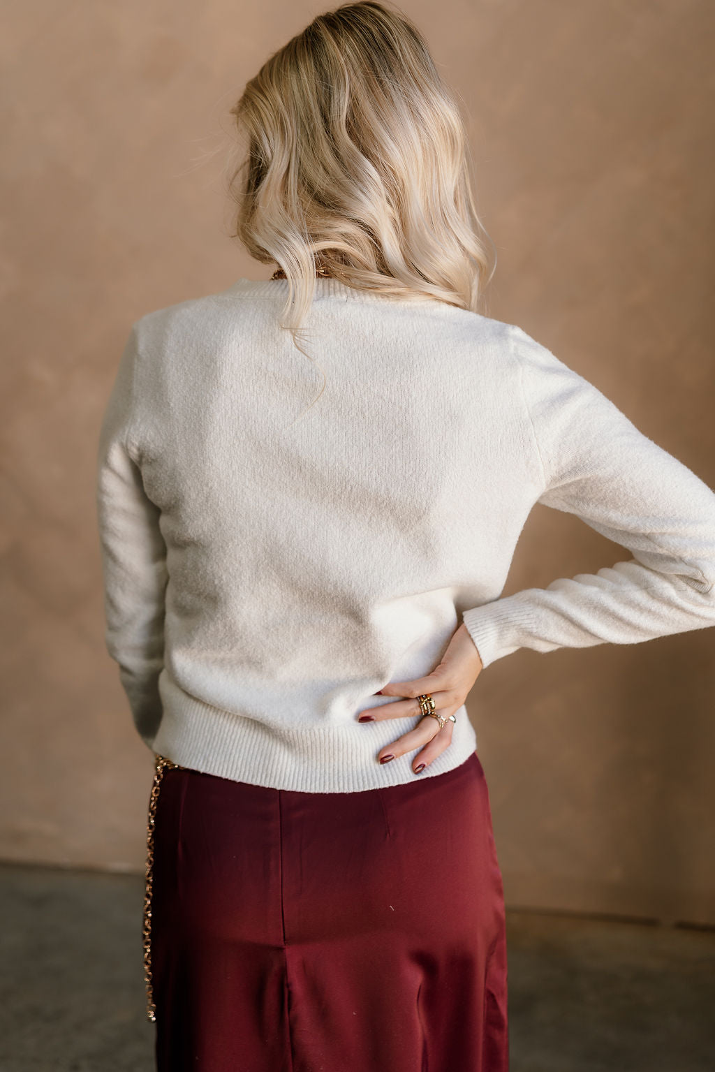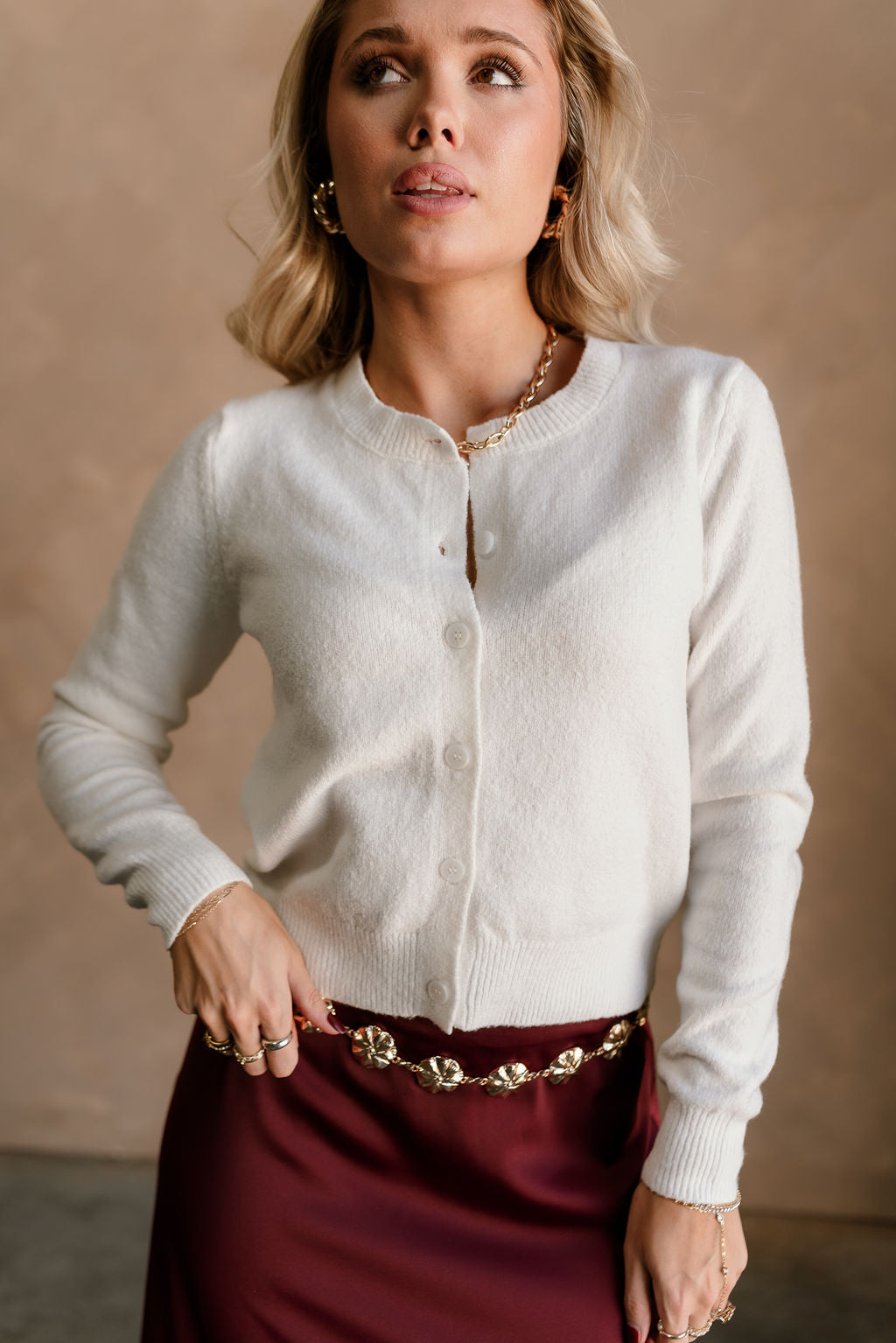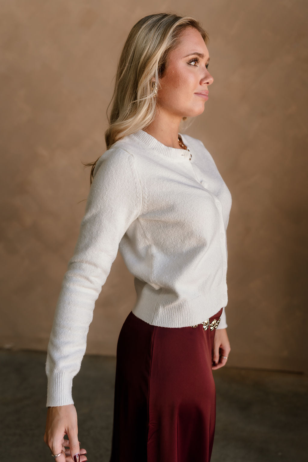 The Sami Off White Button Up Cardigan is a soft and versatile staple made with cozy off white knit fabric that brightens any outfit. Its round neckline and monochrome button-up front keep the look clean and classic, making it an easy piece to layer over tees, tanks, or lightweight sweaters.