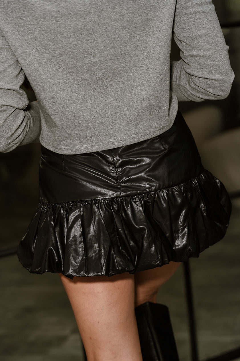 The Samira Black Leather Ruffle Mini Skort adds a bold, feminine edge to any outfit. Made from smooth black faux-leather fabric, this mini skirt features a flirty ruffle hem that moves beautifully while maintaining a structured, sleek silhouette. The back zipper closure ensures a secure fit. The satin black shorts lining provides comfort from day to night.