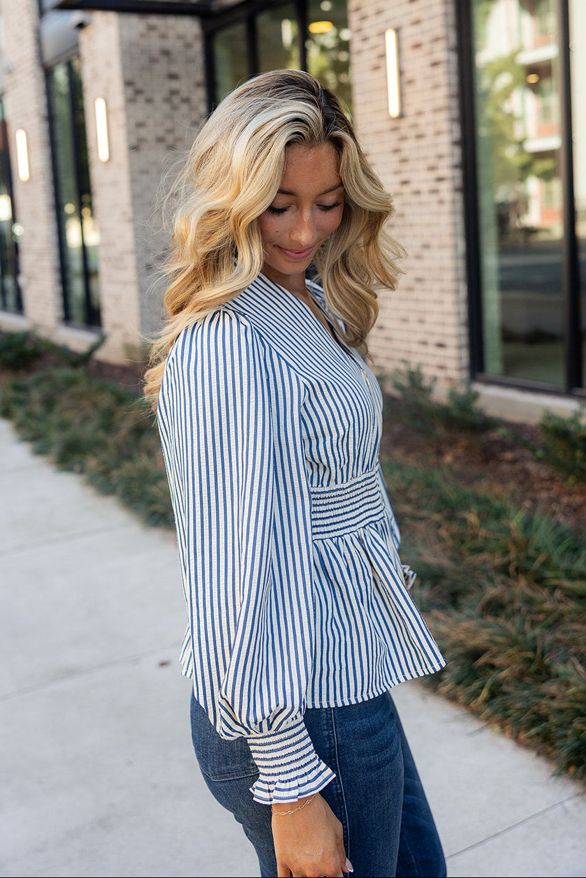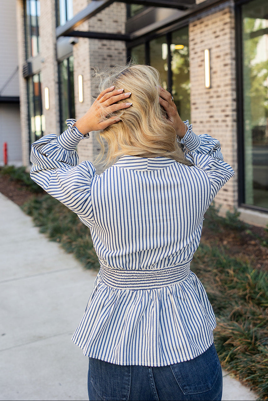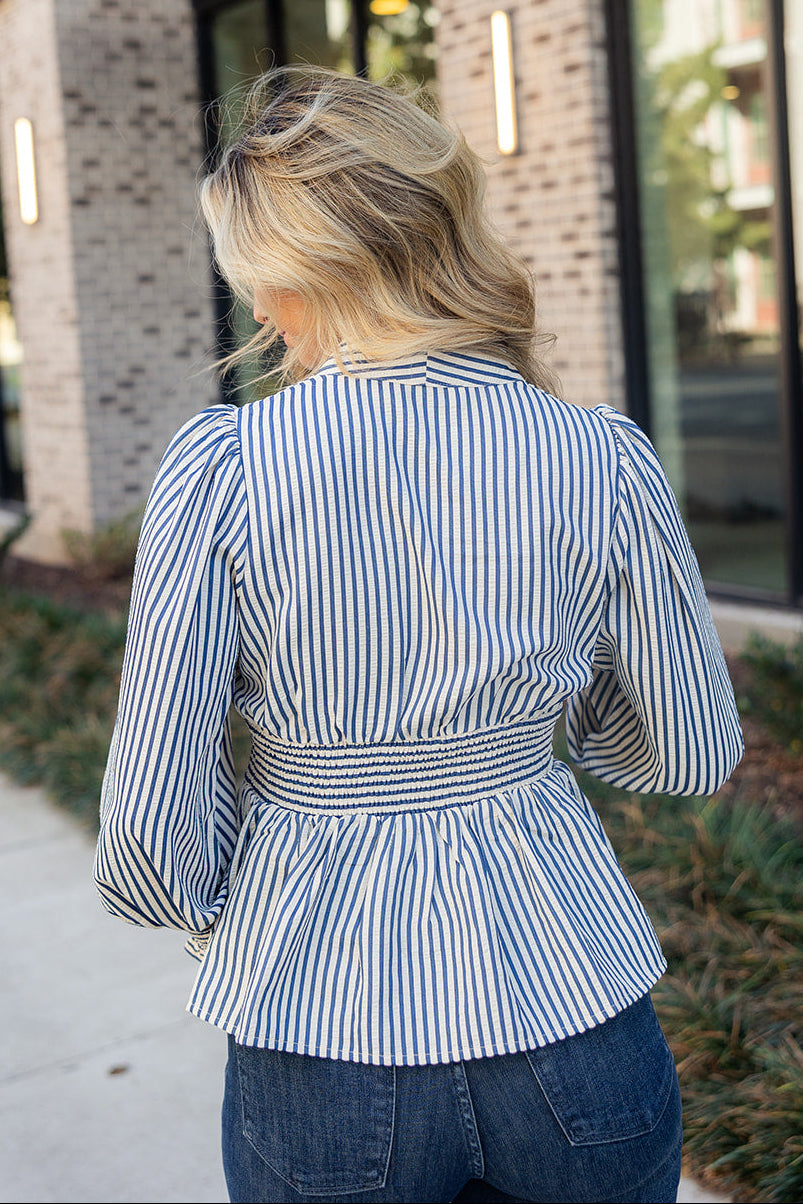 Effortlessly chic with a playful silhouette, the Selah Blue & White Stripe Zip-Up Top is a versatile addition to your wardrobe. Crafted from lightweight blue and white fabric with a classic stripe print, it features a flattering smocked waist, flared hem, and a v-neckline. Long sleeves and a gold front zip-up closure add polished details, making this top perfect for pairing with jeans, skirts, or layered looks for a stylish everyday outfit.