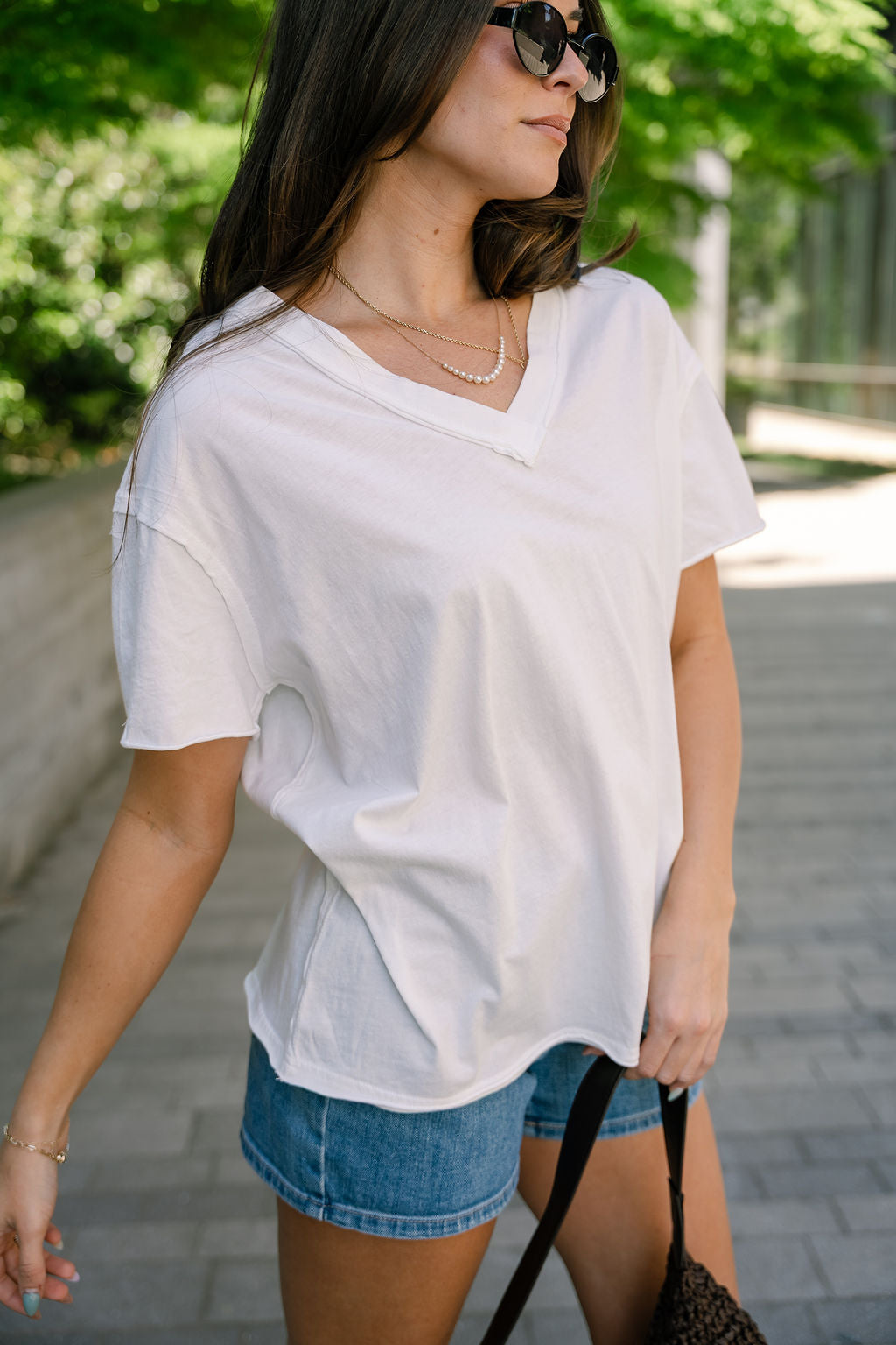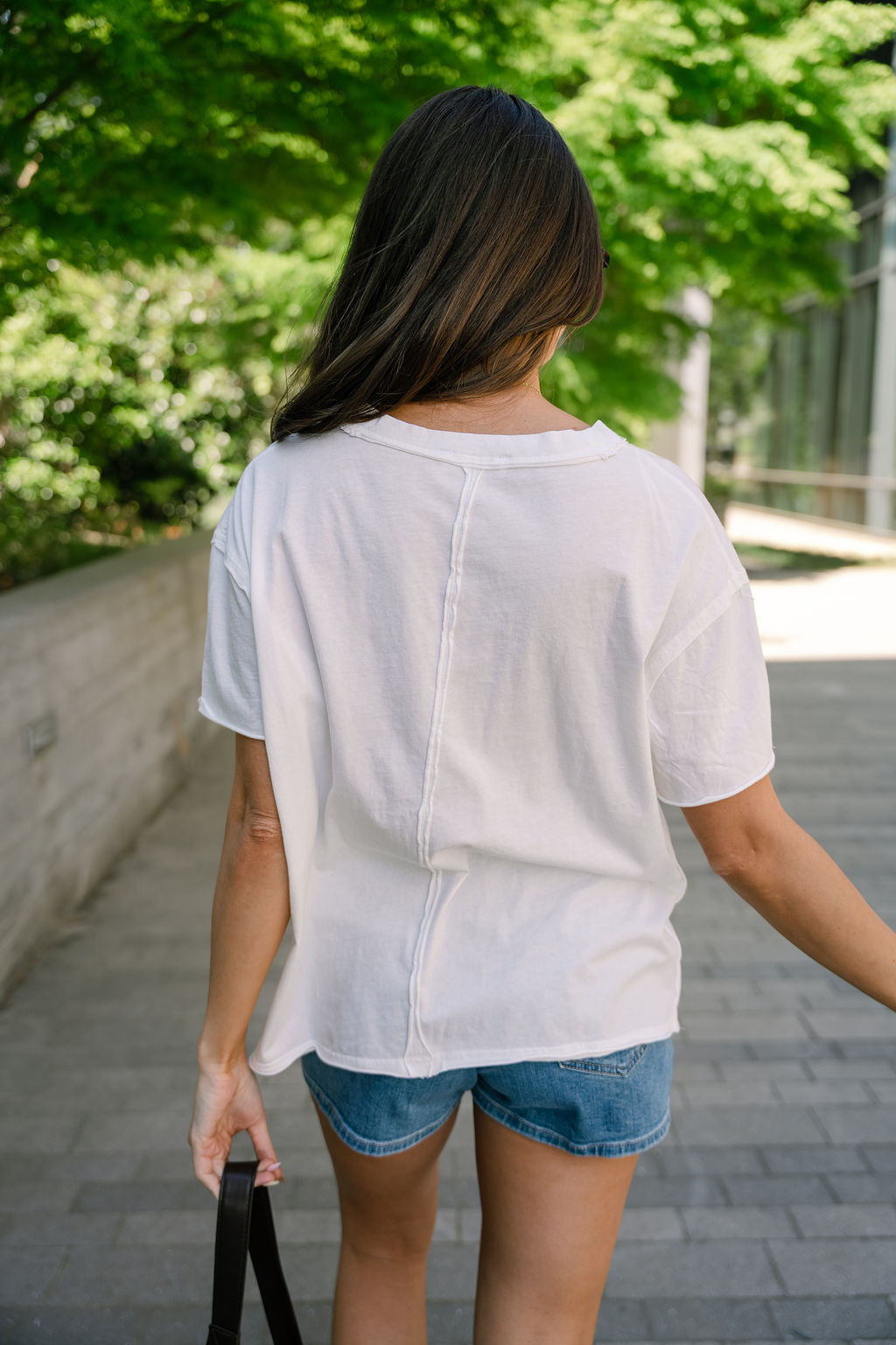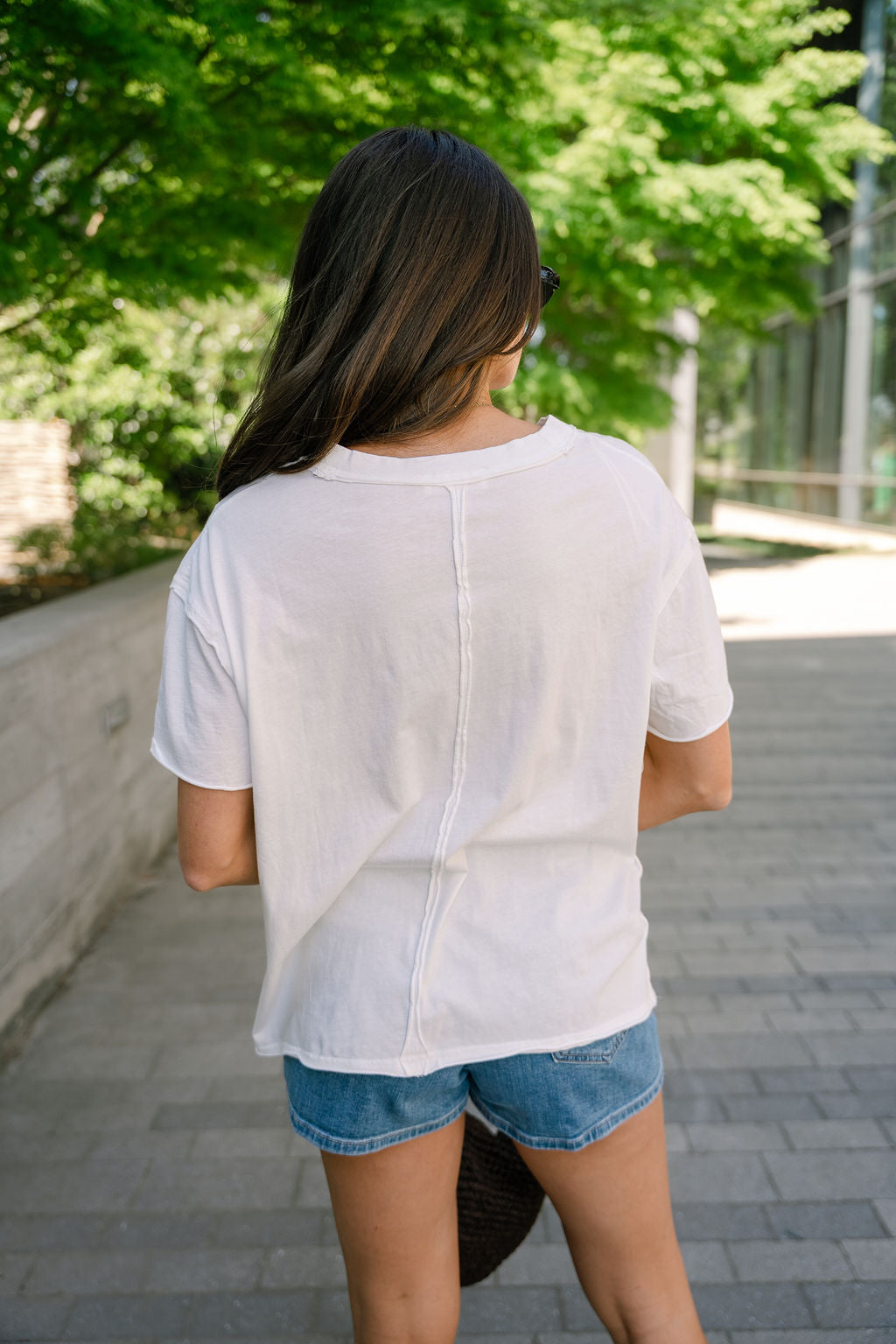 Designed with a flattering v-neckline and classic short sleeves, this top is finished with subtle raw hem detailing for a touch of modern texture and understated style.