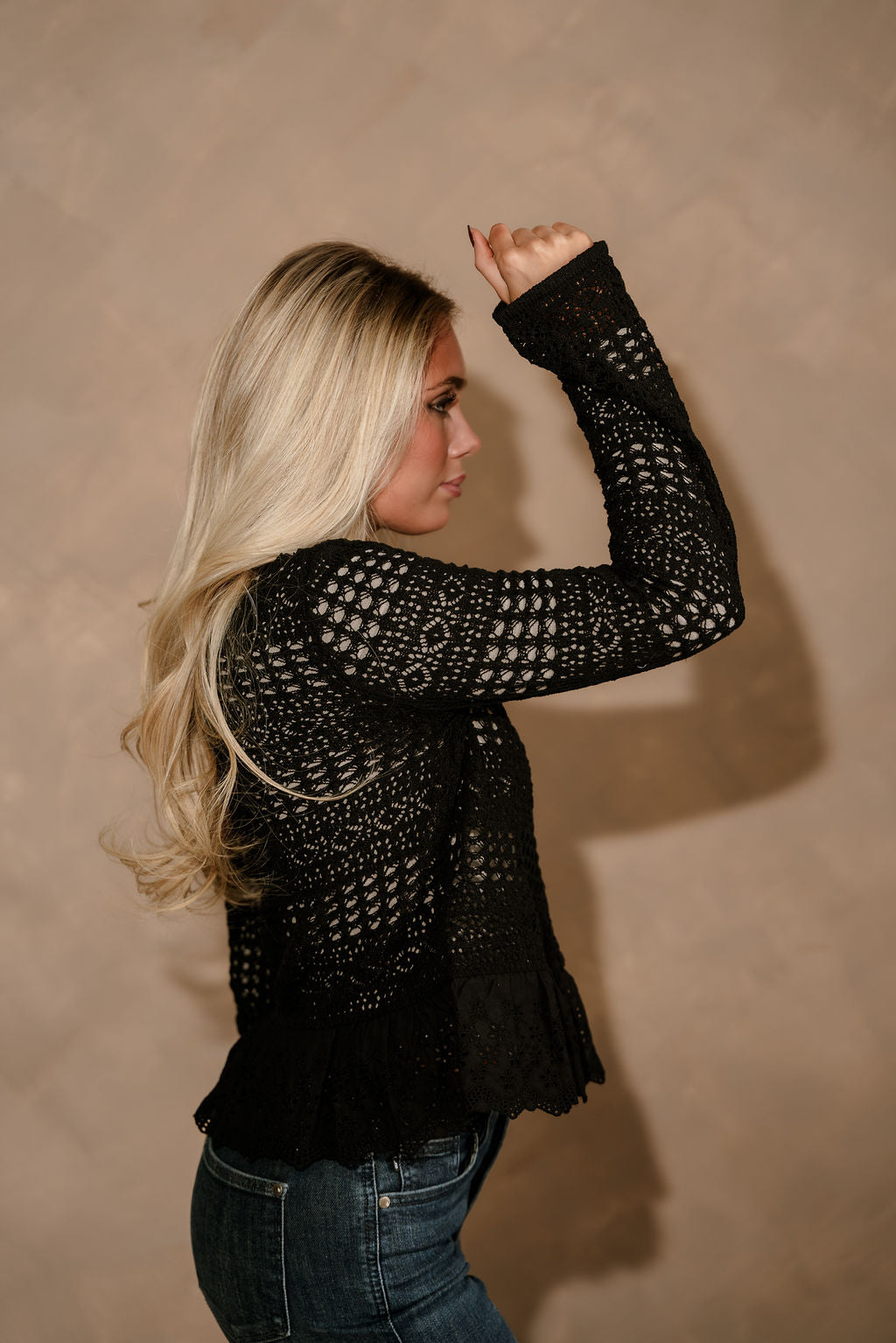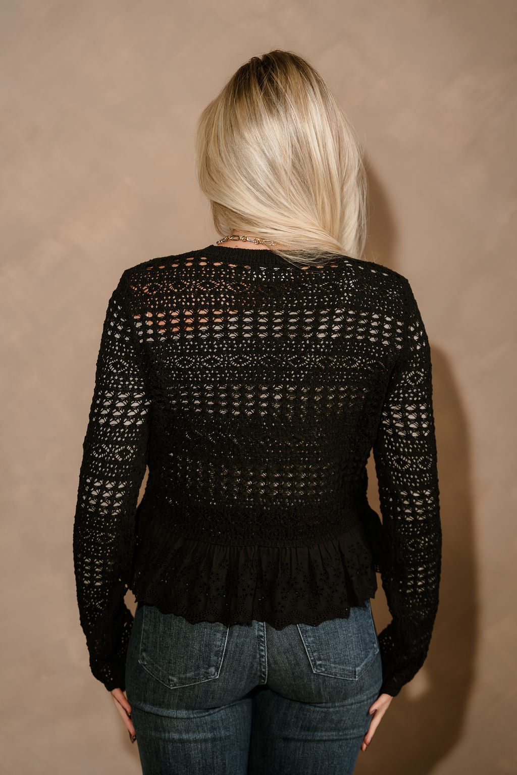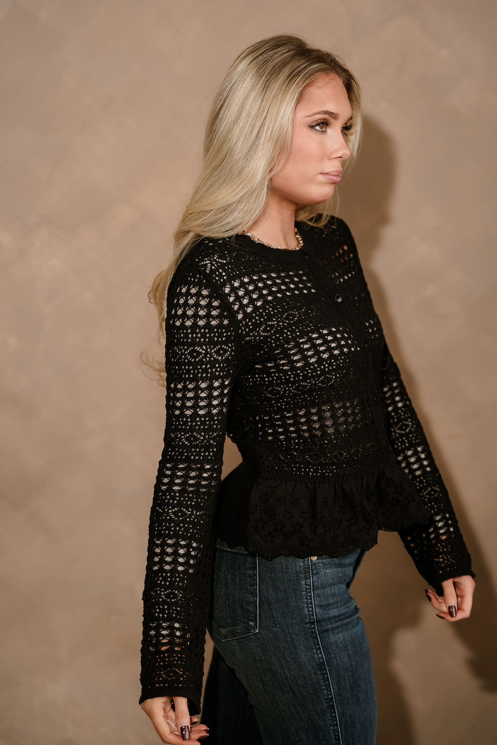 The Selena Black Open Knit & Eyelet Flare Cardigan adds an elegant touch to your layering collection. Crafted from black open knit fabric, this cardigan features delicate eyelet flare trim for a feminine, statement finish. The front button-up design and classic round neckline offer timeless appeal, while long sleeves provide comfortable coverage. Perfect for dressing up casual looks or layering over evening outfits, the Selena cardigan blends effortless charm with modern sophistication.