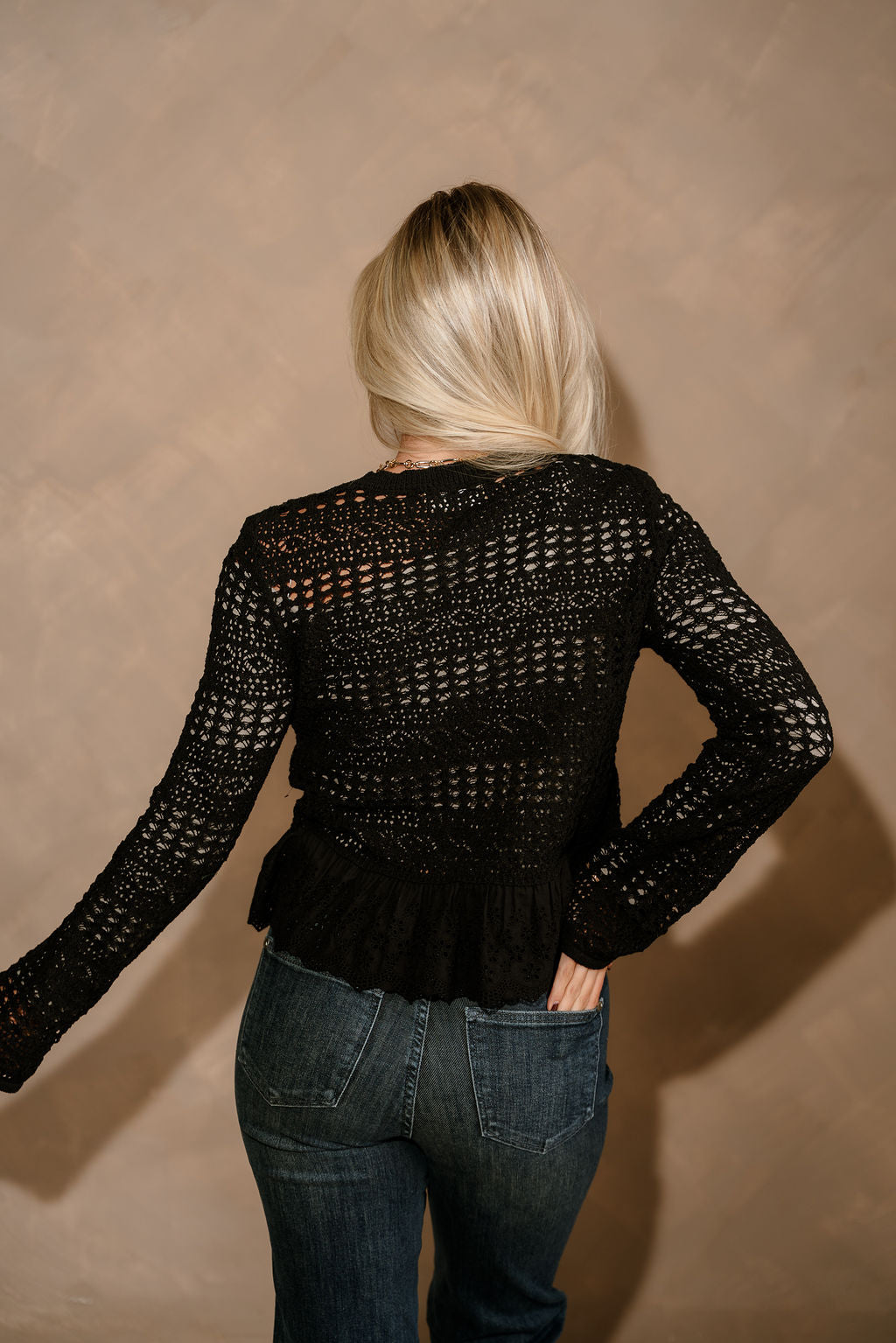 Selena Black Open Knit & Eyelet Flare Cardigan
