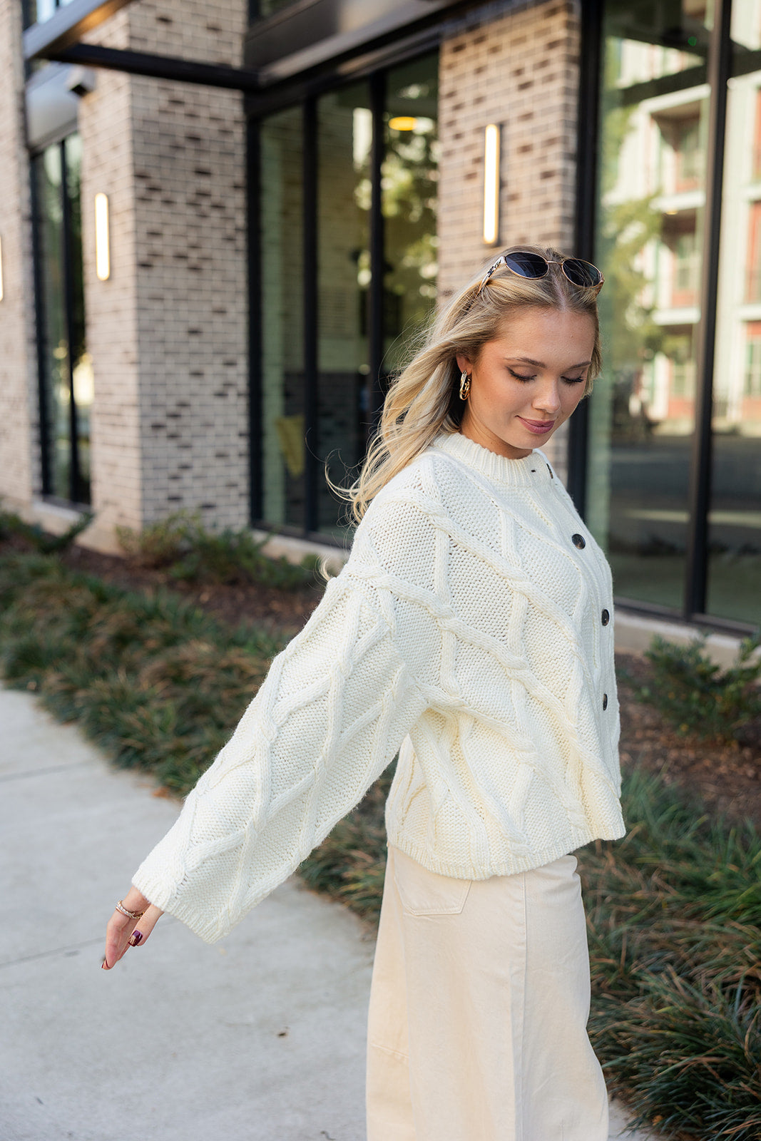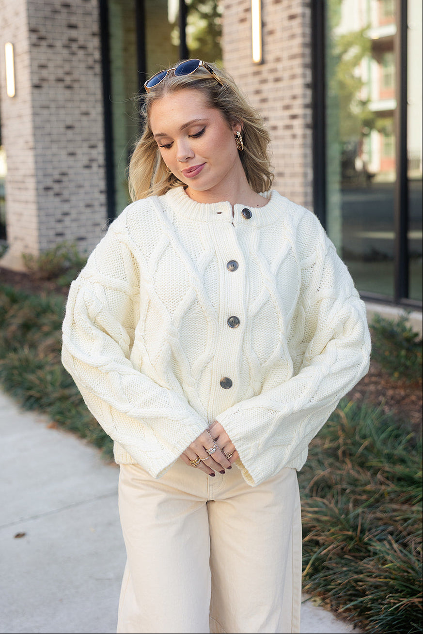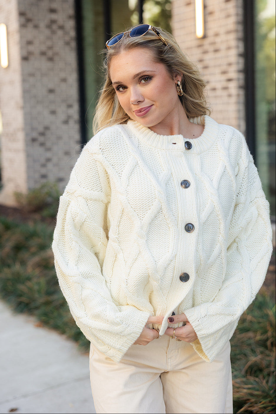 Timeless and versatile, the Selena Cream Knit Button-Up Cardigan brings effortless charm to any outfit. Crafted from soft cream knit fabric, it features a classic round neckline, long sleeves, and a front button-up closure for easy layering. Perfect for pairing with denim, dresses, or skirts, this cozy essential adds a clean and polished finish to your everyday style.