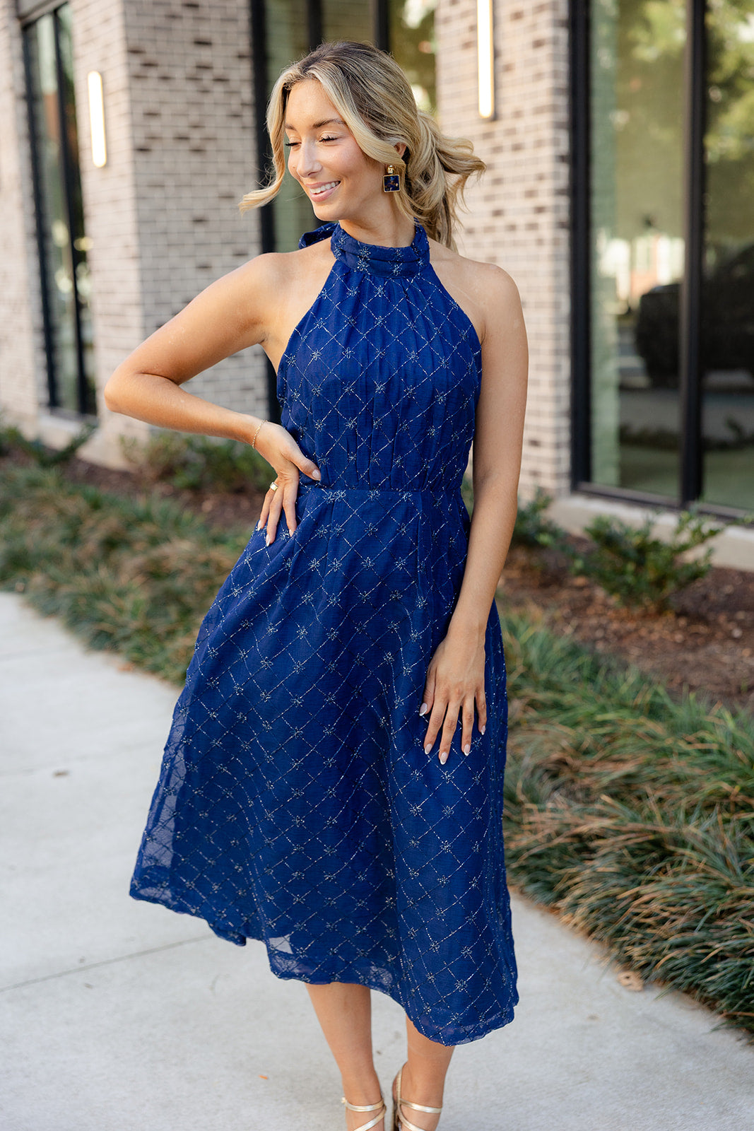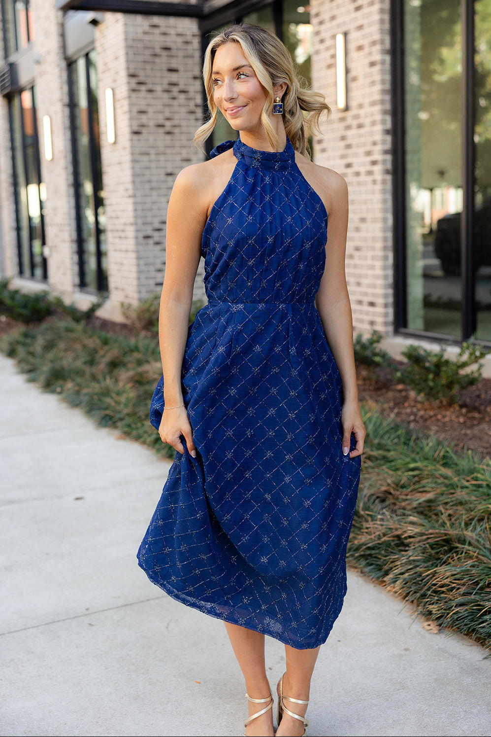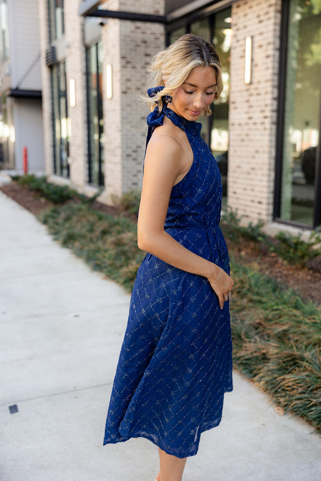 Romantic and effortlessly chic, the Selena Navy Blue Halter Midi Dress combines delicate details with a flattering silhouette. Crafted from lightweight navy blue fabric with monochrome and metallic stitching, it features a subtle floral print, a midi-length cut, and matching navy lining. Designed with a halter neckline with tie straps, an open back, and a back zipper closure, this dress is perfect for weddings, parties, or any occasion where elegance meets ease.