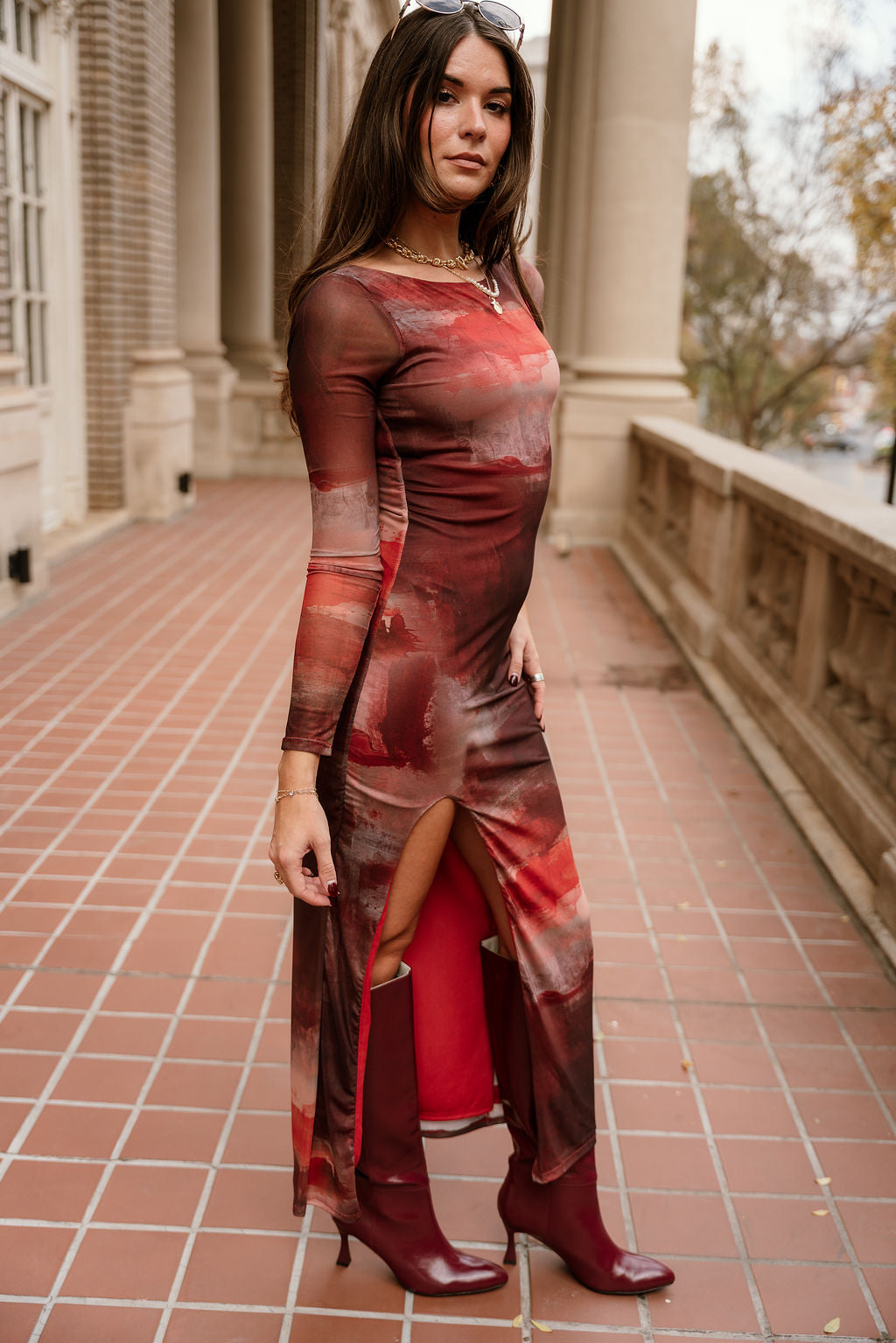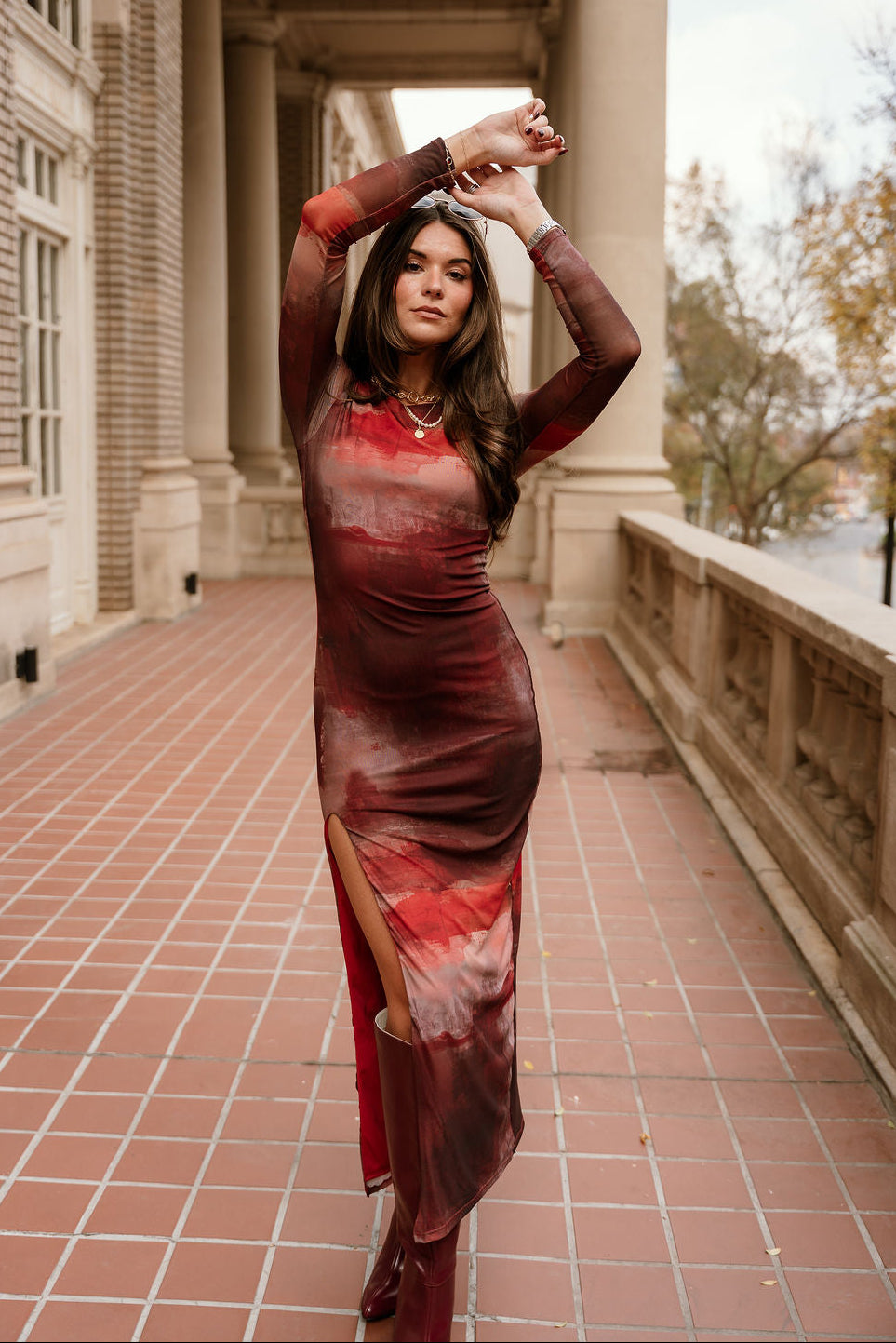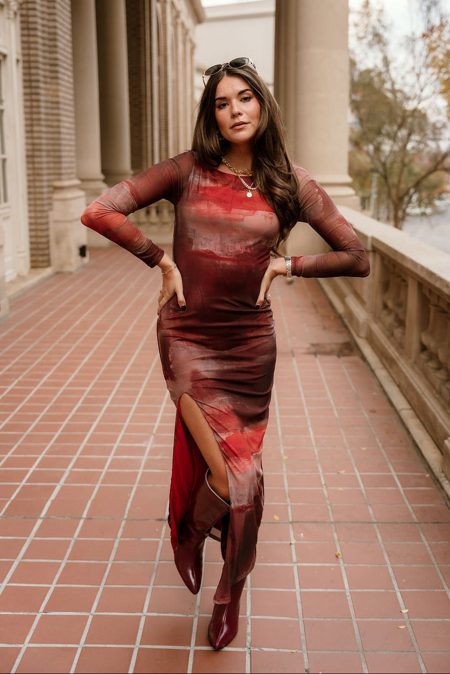 Turn heads with the striking elegance of the Selena Rust Multi Mesh Maxi Dress. Crafted from captivating rust multi mesh fabric, this dress blends rich tones and airy texture for a look that’s equal parts bold and ethereal. Its flowy maxi length creates a graceful silhouette, while the thigh-high side slit adds just the right amount of movement and allure.
