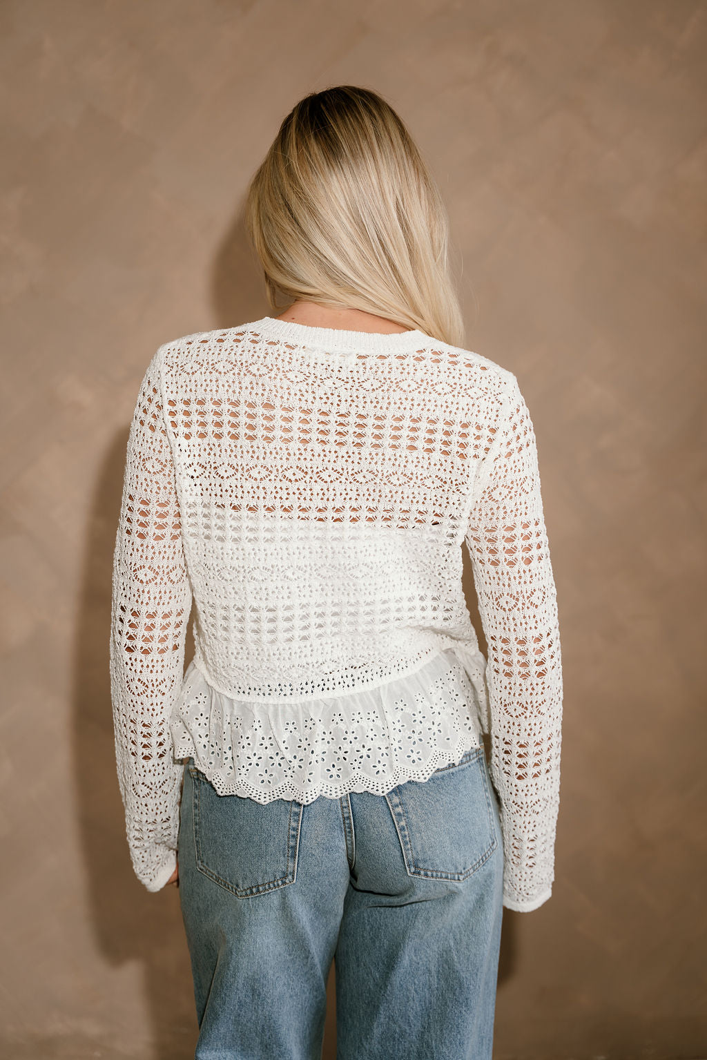 The Selena White Open Knit & Eyelet Flare Cardigan is a beautifully detailed layering piece that adds a soft, feminine touch to any outfit. Crafted from white open knit fabric, this cardigan features delicate eyelet flare trim that brings texture and movement to its classic silhouette. The round neckline and front button-up design keep the look timeless and versatile.