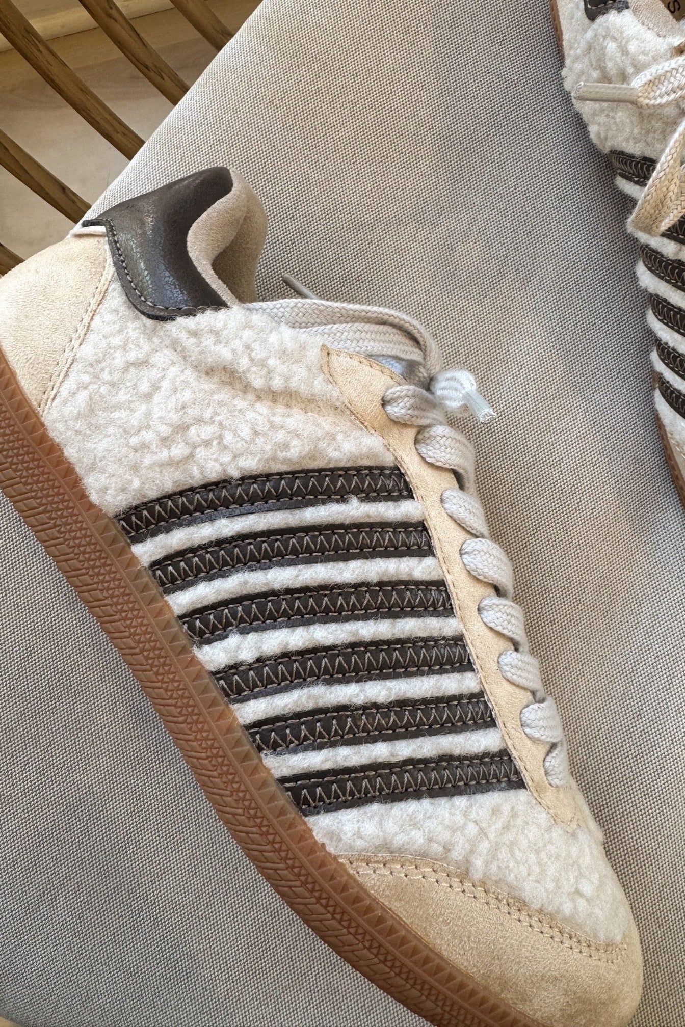 Cozy meets cool in the Shu Shop Stevie Beige Shearling Sneaker. Crafted with a soft beige faux shearling and faux suede upper, this fashion-forward sneaker delivers comfort and style in equal measure. Dark brown faux leather trim adds contrast and a touch of edge, while the lace-up front is finished with a signature metallic SHUSHOP charm for a hint of shine. Grounded by a classic gum rubber sole and rounded toe, the Stevie is the perfect off-duty sneaker with a luxe twist.