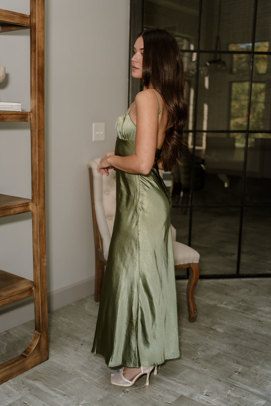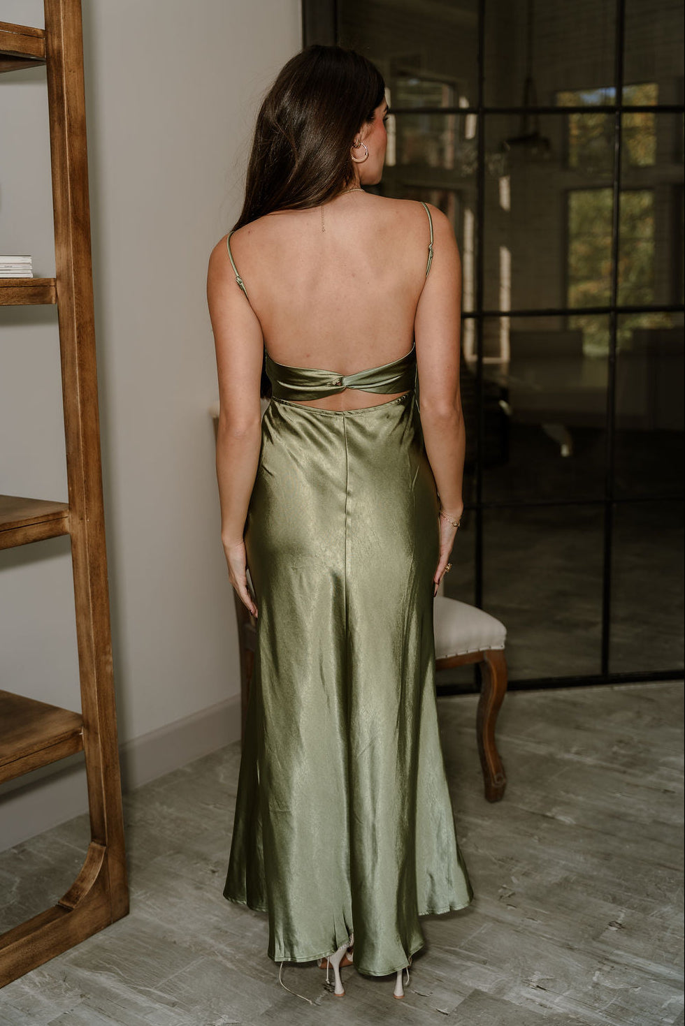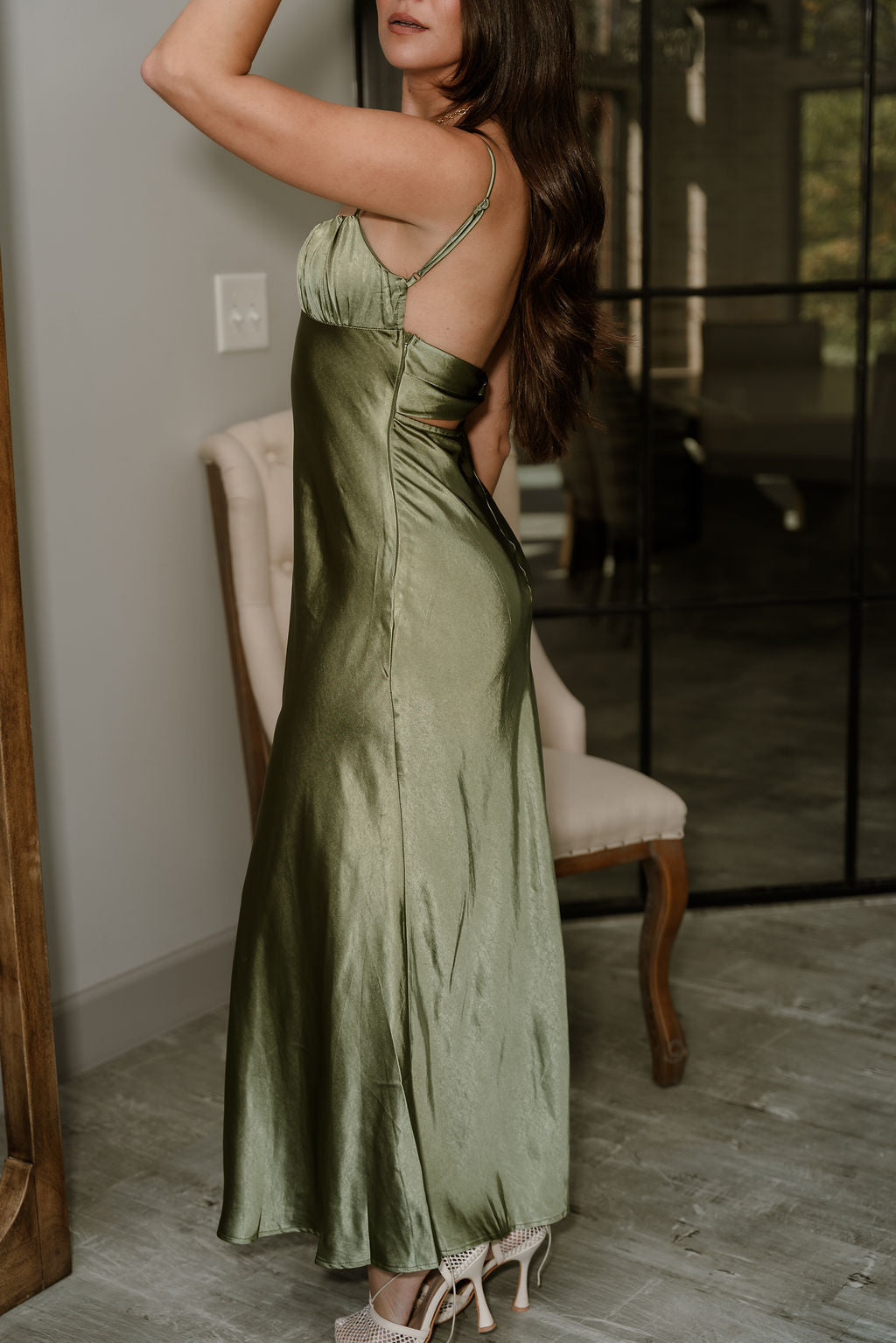 Embrace refined elegance with the Sienna Olive Green Satin Maxi Dress. Designed in lustrous olive green satin, this flowing maxi dress exudes sophistication with a soft, fluid drape. The pleated sweetheart neckline adds a romantic touch, while adjustable straps ensure the perfect fit. A stunning back twist detail creates visual interest and modern allure, complemented by a discreet side zipper closure for a smooth finish. Perfect for weddings, formal occasions, or elegant evenings out, the Sienna dress captures timeless beauty with an effortlessly graceful silhouette.