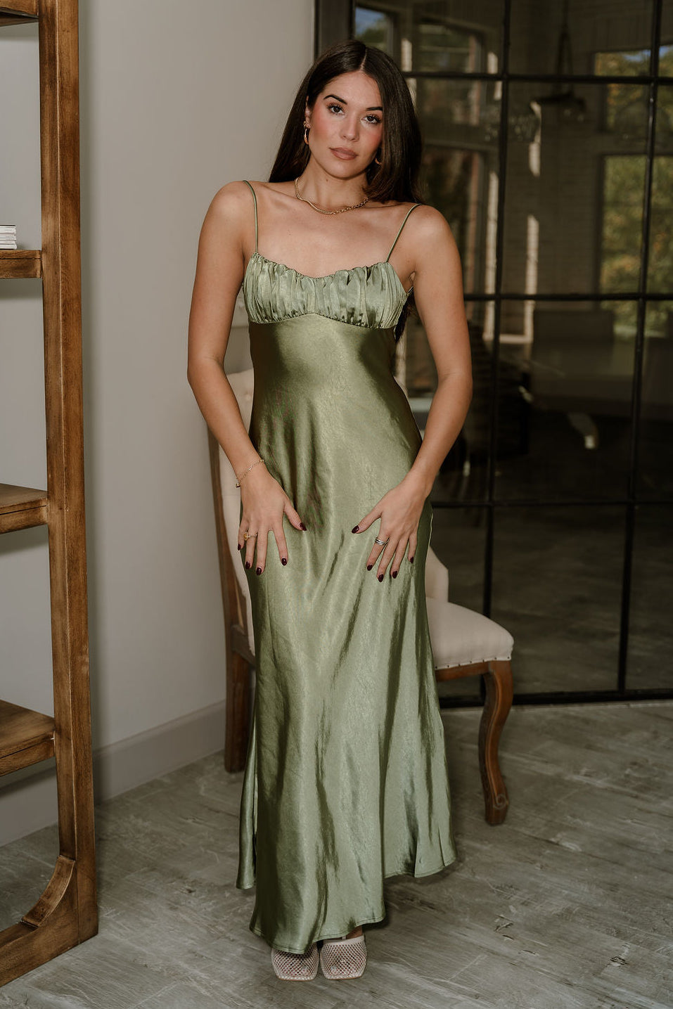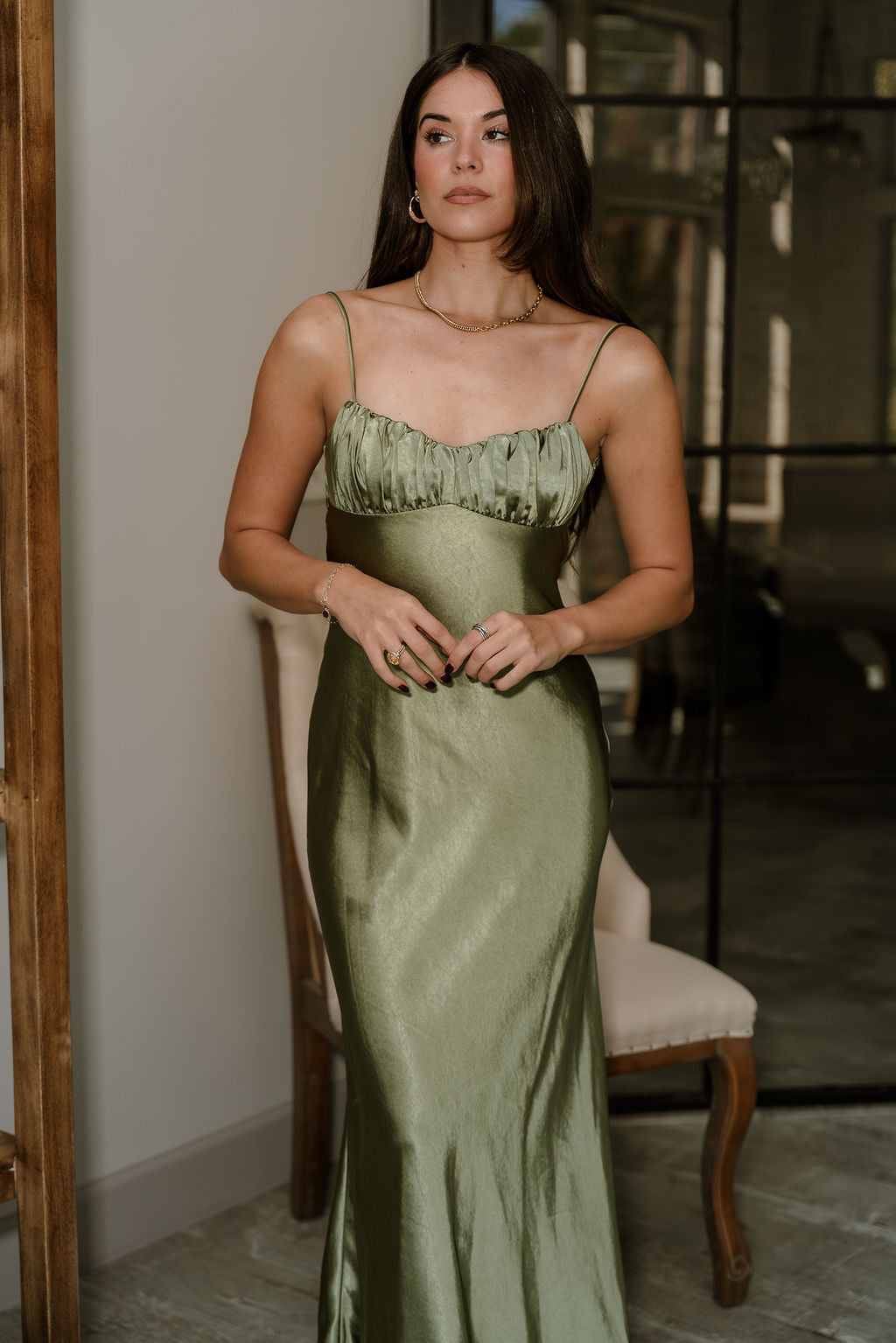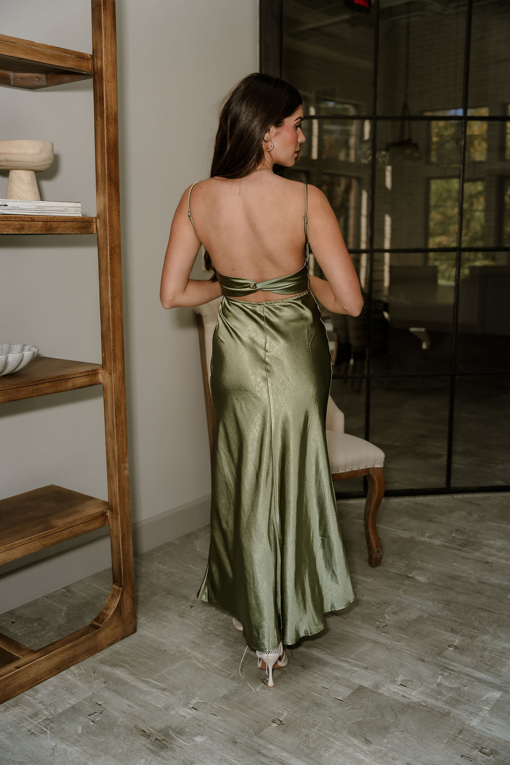 Embrace refined elegance with the Sienna Olive Green Satin Maxi Dress. Designed in lustrous olive green satin, this flowing maxi dress exudes sophistication with a soft, fluid drape. The pleated sweetheart neckline adds a romantic touch, while adjustable straps ensure the perfect fit. A stunning back twist detail creates visual interest and modern allure, complemented by a discreet side zipper closure for a smooth finish. Perfect for weddings, formal occasions, or elegant evenings out, the Sienna dress captures timeless beauty with an effortlessly graceful silhouette.