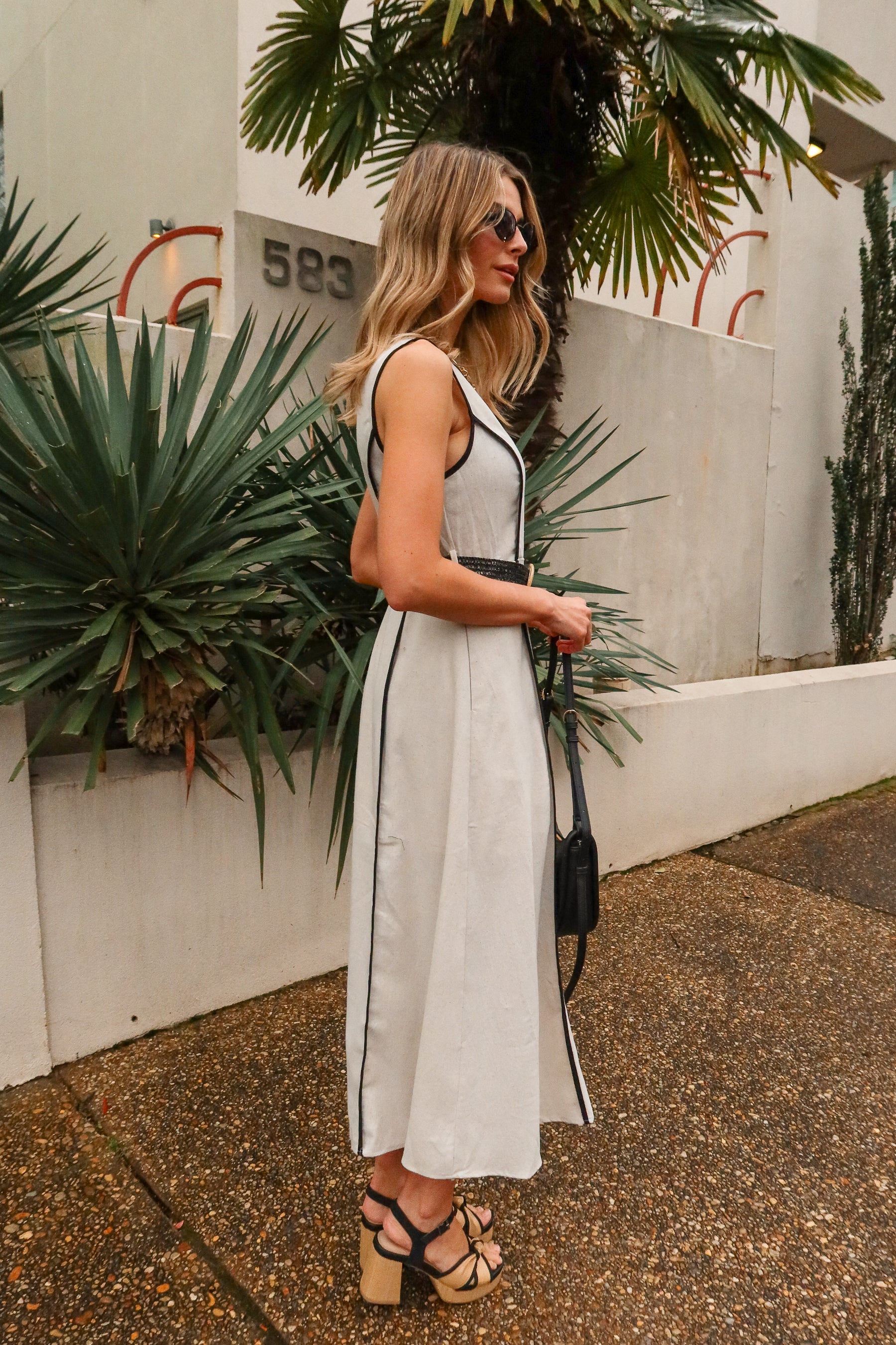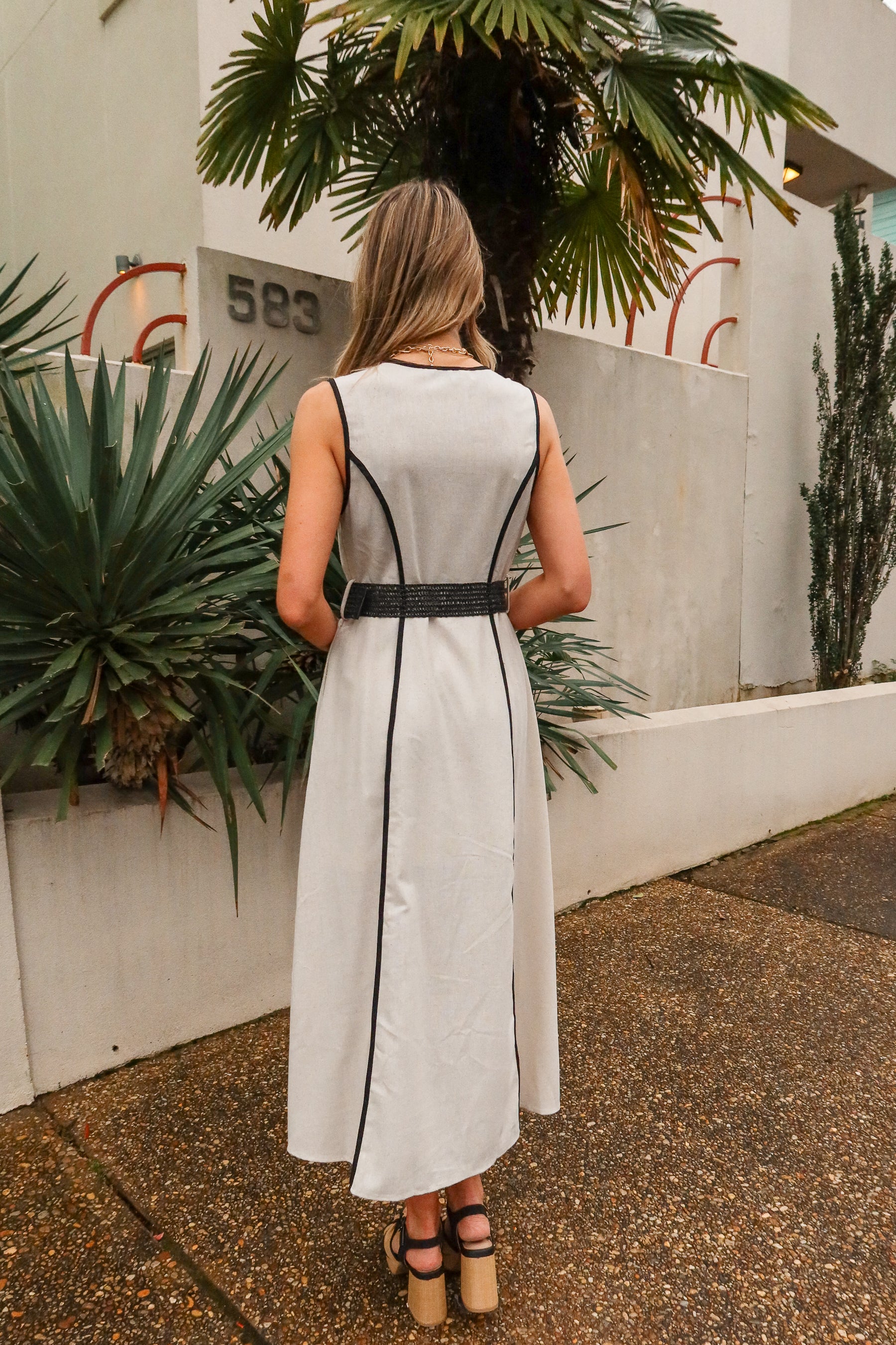Effortlessly chic with modern detailing, the Simone Natural & Black Belted Midi Dress is a versatile wardrobe staple. Crafted from lightweight natural linen fabric, this sleeveless midi dress features subtle black trim accents and a flattering V-neckline for a polished, elevated look. Side pockets add practicality. The black woven belt with a light tortoise buckle cinches the waist for a flattering silhouette.