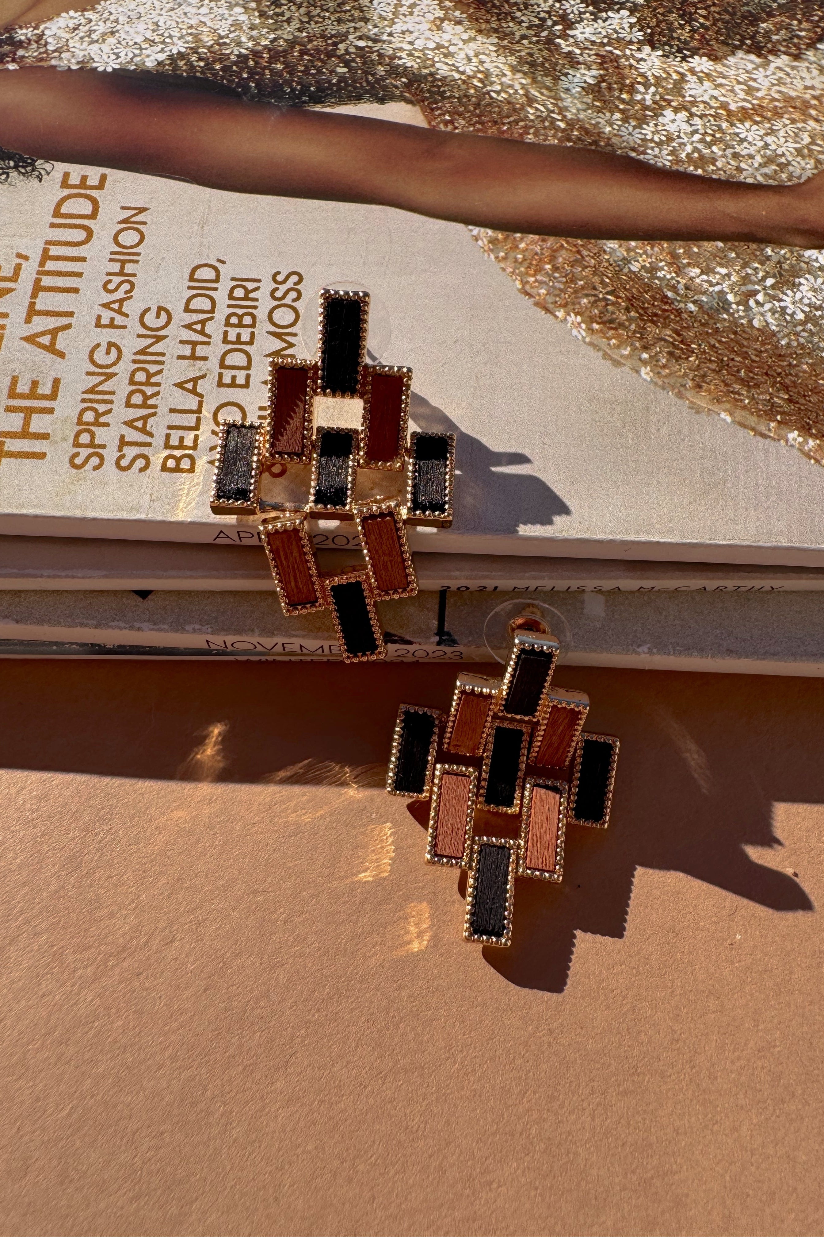 Bold yet sophisticated, the Sofia Black & Brown Colorblock Dangle Earring makes a statement with ease. Featuring a striking black and brown colorblock design in a modern dangle silhouette, these earrings are finished with polished gold details for a touch of elegance. Lightweight and eye-catching, they’re perfect for elevating everyday looks or adding contrast to evening outfits. A chic accessory that blends timeless tones with contemporary style.