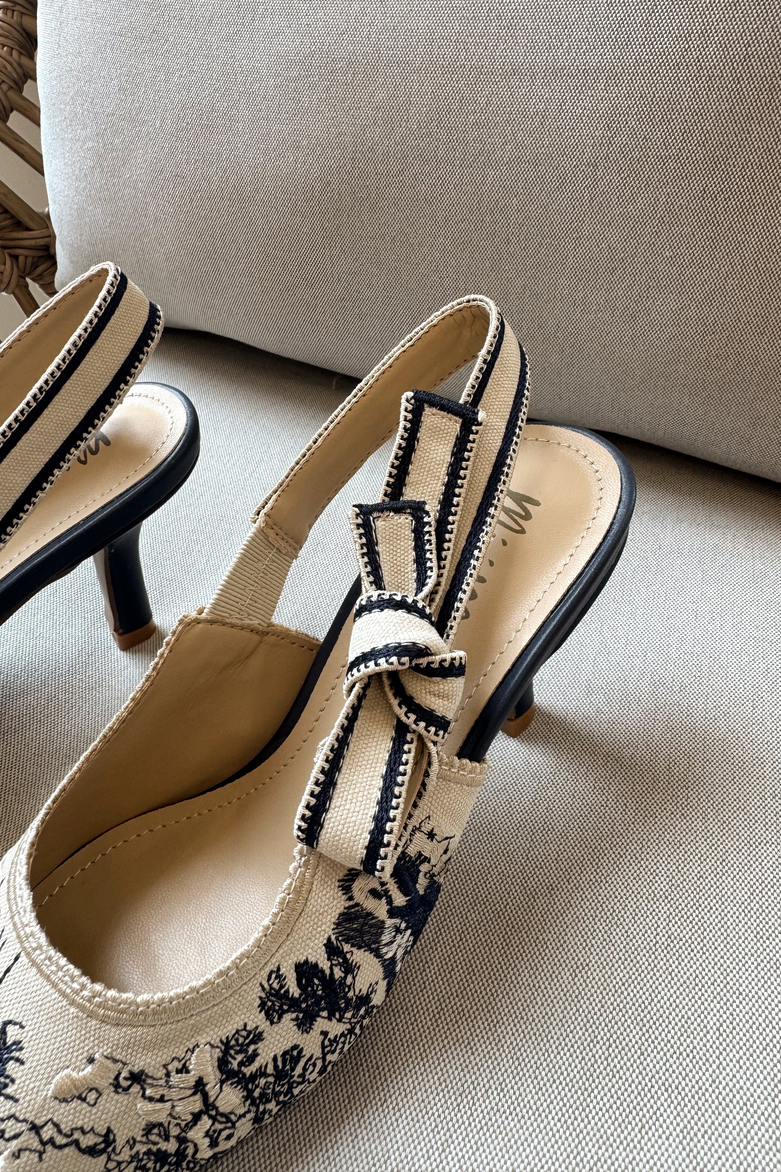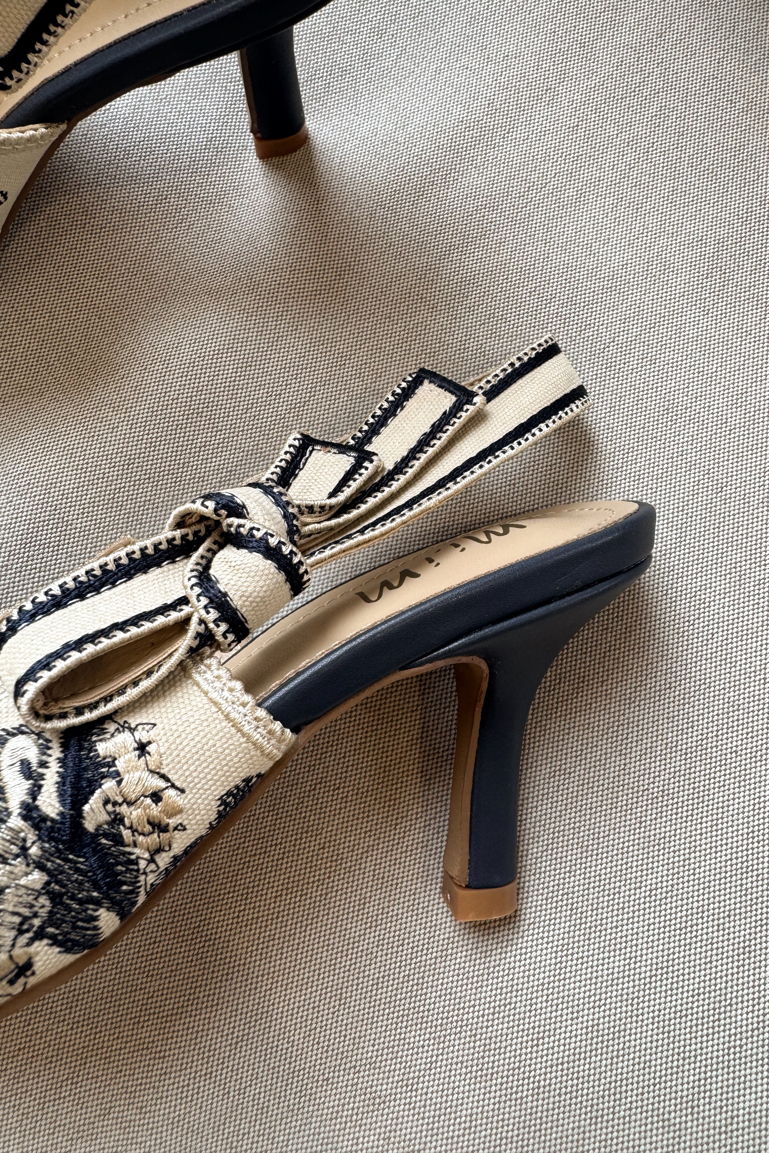 Embrace timeless charm with the Solana Blue & Ivory Slingback Tie Heel, a feminine favorite that blends classic design with playful detail. Crafted from navy blue and ivory canvas fabric with a delicate floral print, this heel adds a touch of romance to any look. The pointed toe creates an elegant silhouette, while the slingback ankle strap with a chic tie detail offers a customizable, graceful finish. Set on a comfortable 3 inch heel, the Solana is perfect for both daytime elegance and evening sophistication.