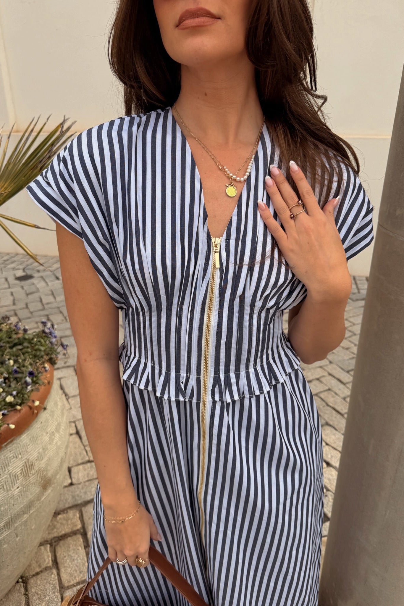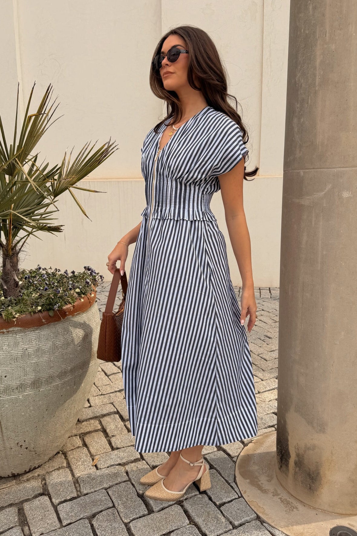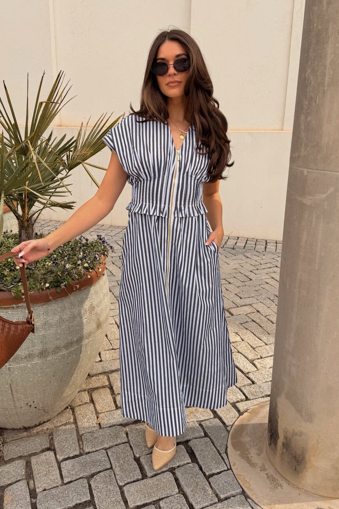 The flattering V-neckline is accented by a sleek gold zip-up front, adding a touch of sophistication and allowing for adjustable styling. Upper pleated details create subtle texture and shape, while the sleeveless design keeps the silhouette fresh and versatile. Falling to a midi length, the Solana Dress strikes the perfect balance between casual ease and elevated charm.