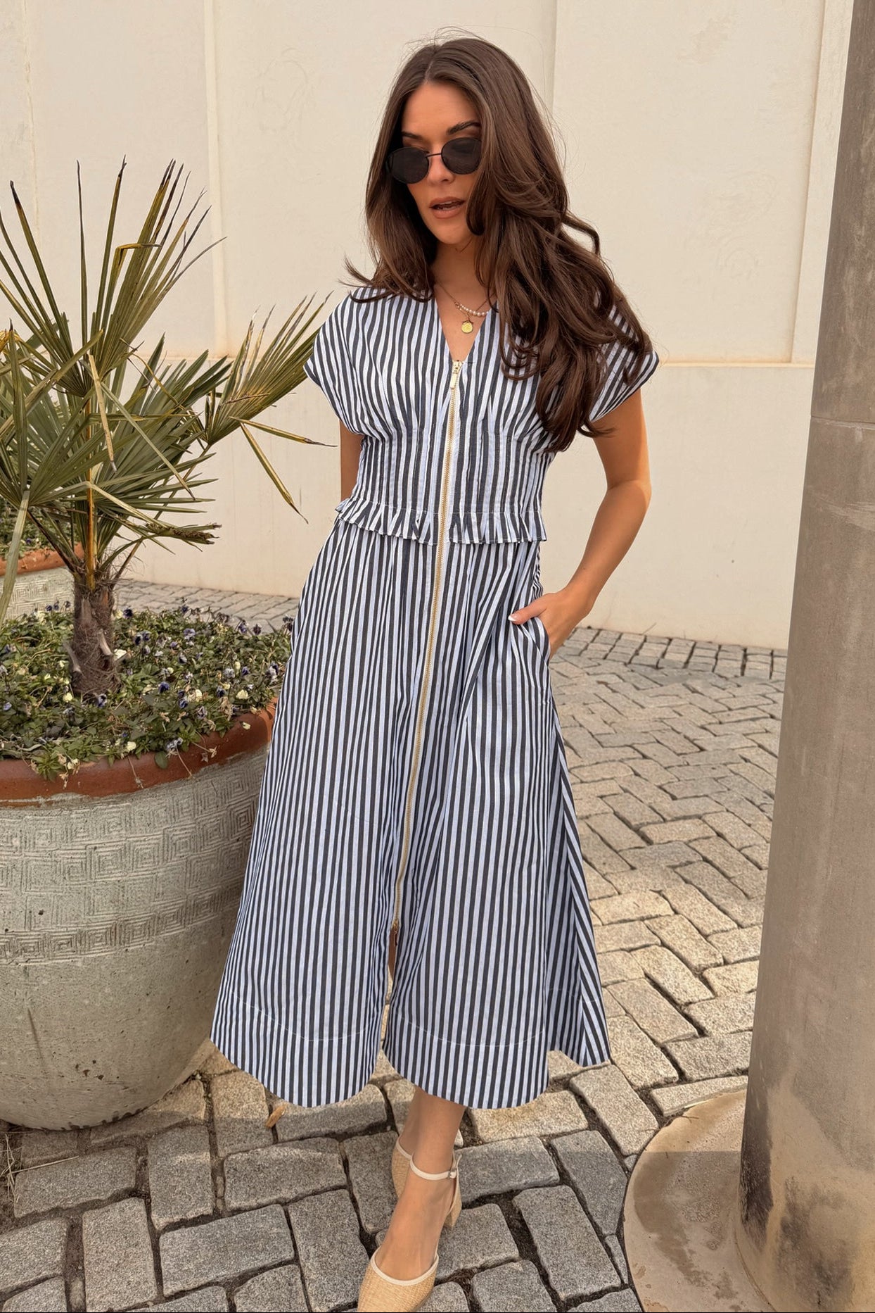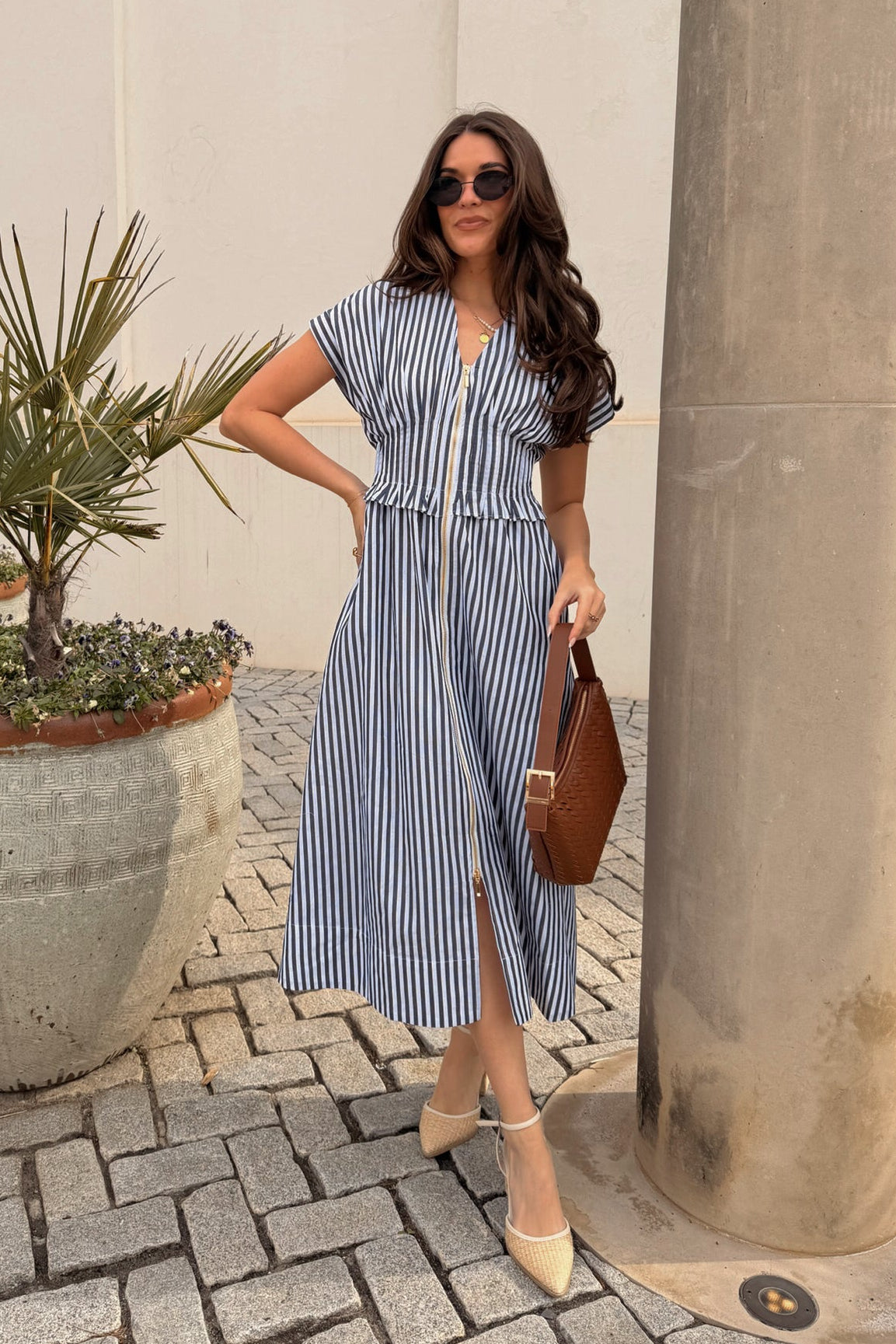 Thoughtful details like functional side pockets add everyday practicality, while a back tie allows for a customizable, flattering fit at the waist. Whether styled with sandals for daytime outings, sneakers for a relaxed look, or wedges for a polished ensemble, this dress transitions seamlessly from day to night. The Solana Navy & White Stripe Zip-Up Midi Dress is a go-to wardrobe staple that combines classic stripes with modern details for effortless, everyday elegance.