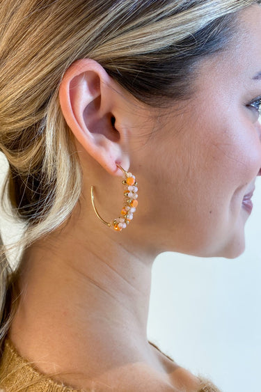 The Starburst Earrings features gold open hoops with orange and peach beads.