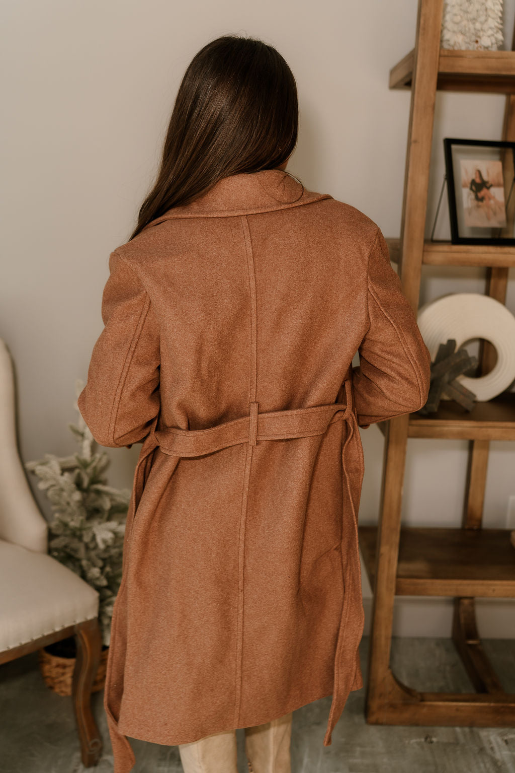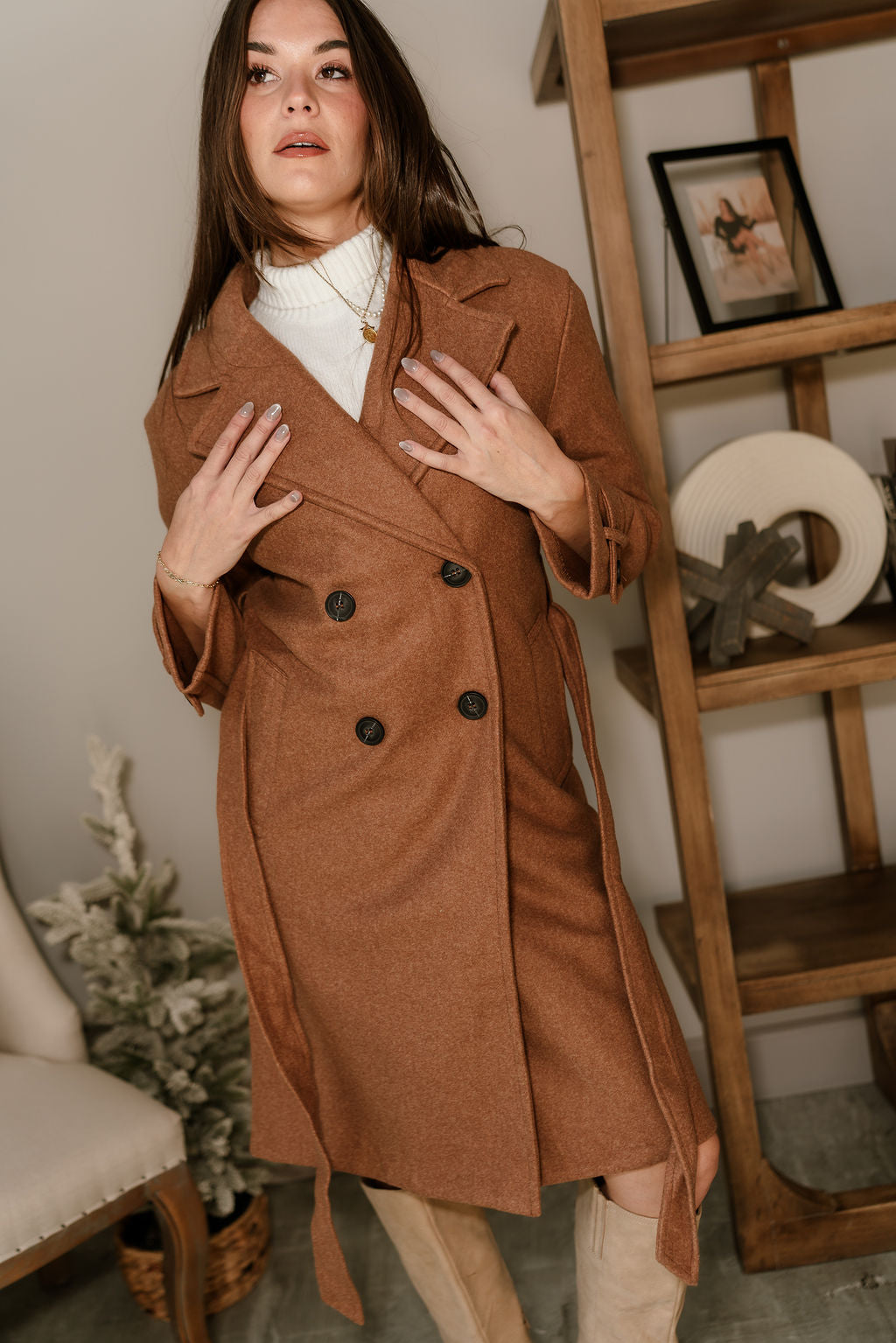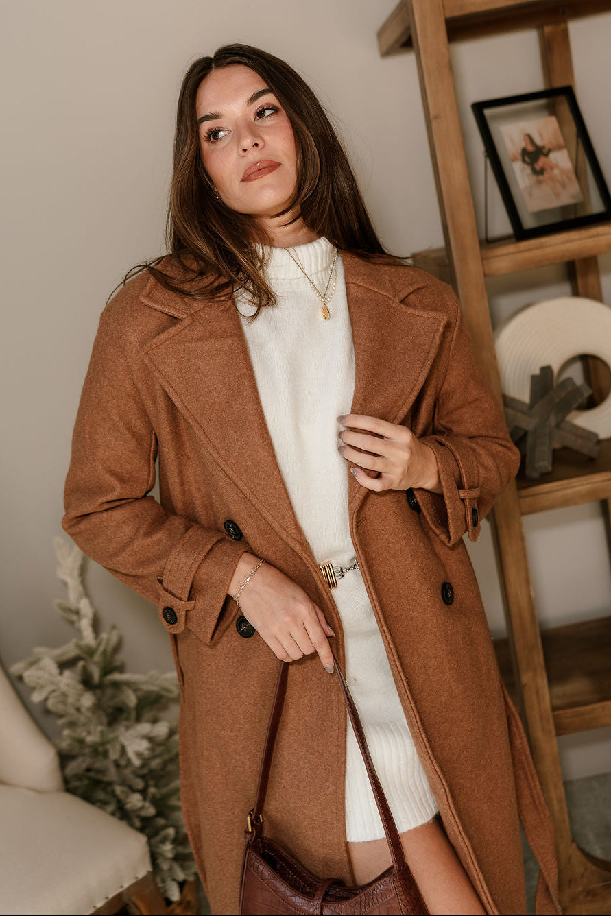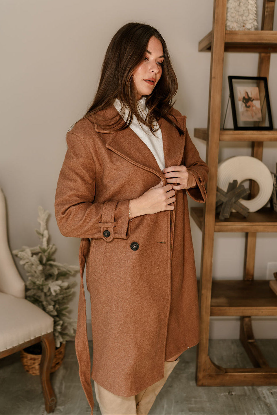 Versatile and effortlessly chic, the Stella Tie Waist Coat pairs beautifully with everything from jeans and boots for casual outings to dresses and heels for a more elevated look. With its rich camel hue, flattering fit, and cozy fabric, this coat is a must-have layering piece that combines comfort, elegance, and timeless appeal for any season.
