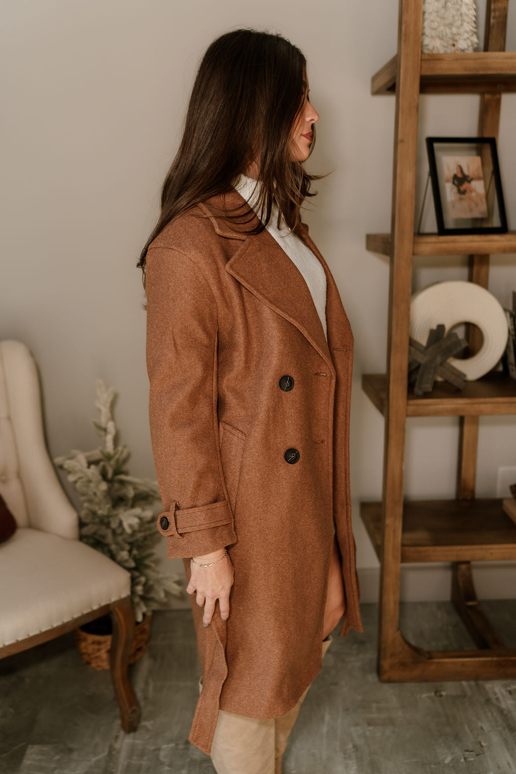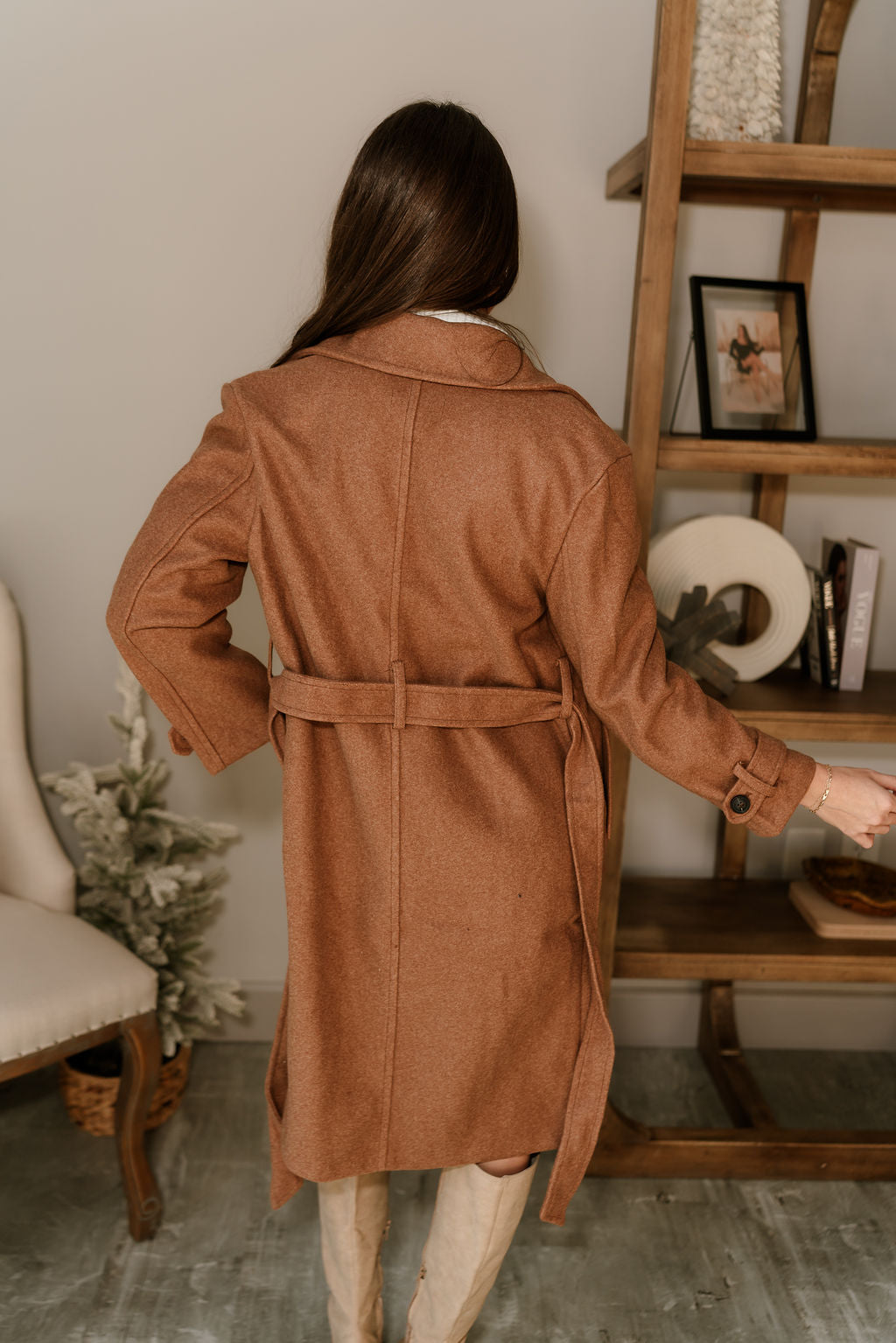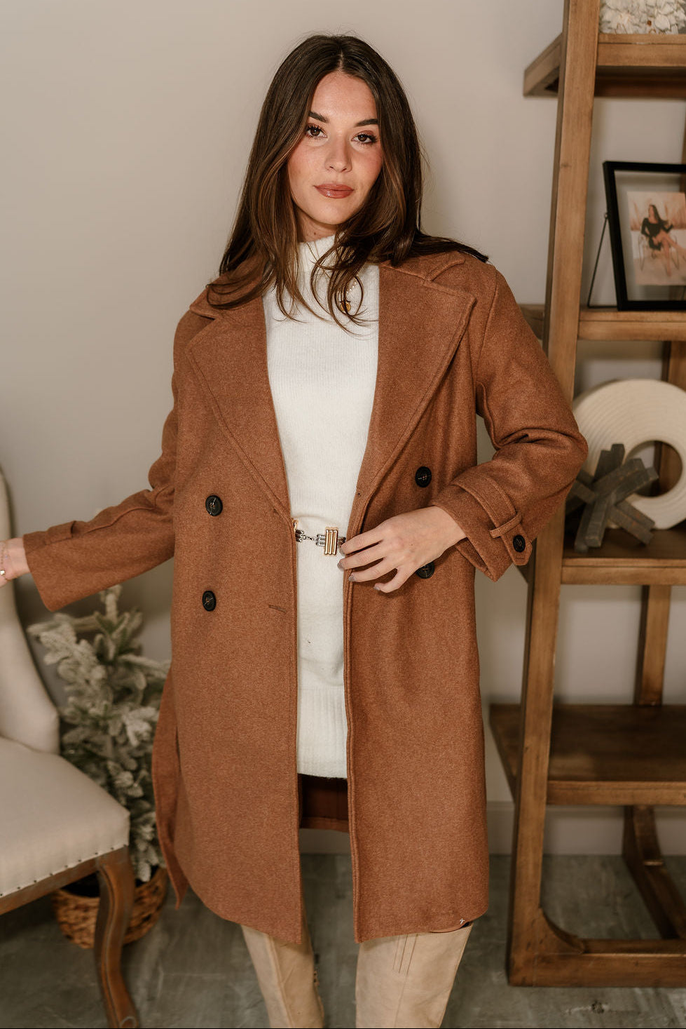 Versatile and effortlessly chic, the Stella Tie Waist Coat pairs beautifully with everything from jeans and boots for casual outings to dresses and heels for a more elevated look. With its rich camel hue, flattering fit, and cozy fabric, this coat is a must-have layering piece that combines comfort, elegance, and timeless appeal for any season.