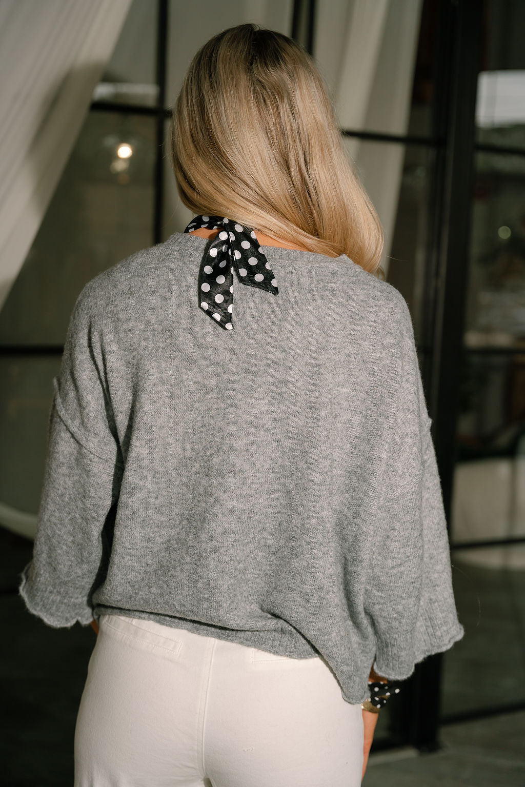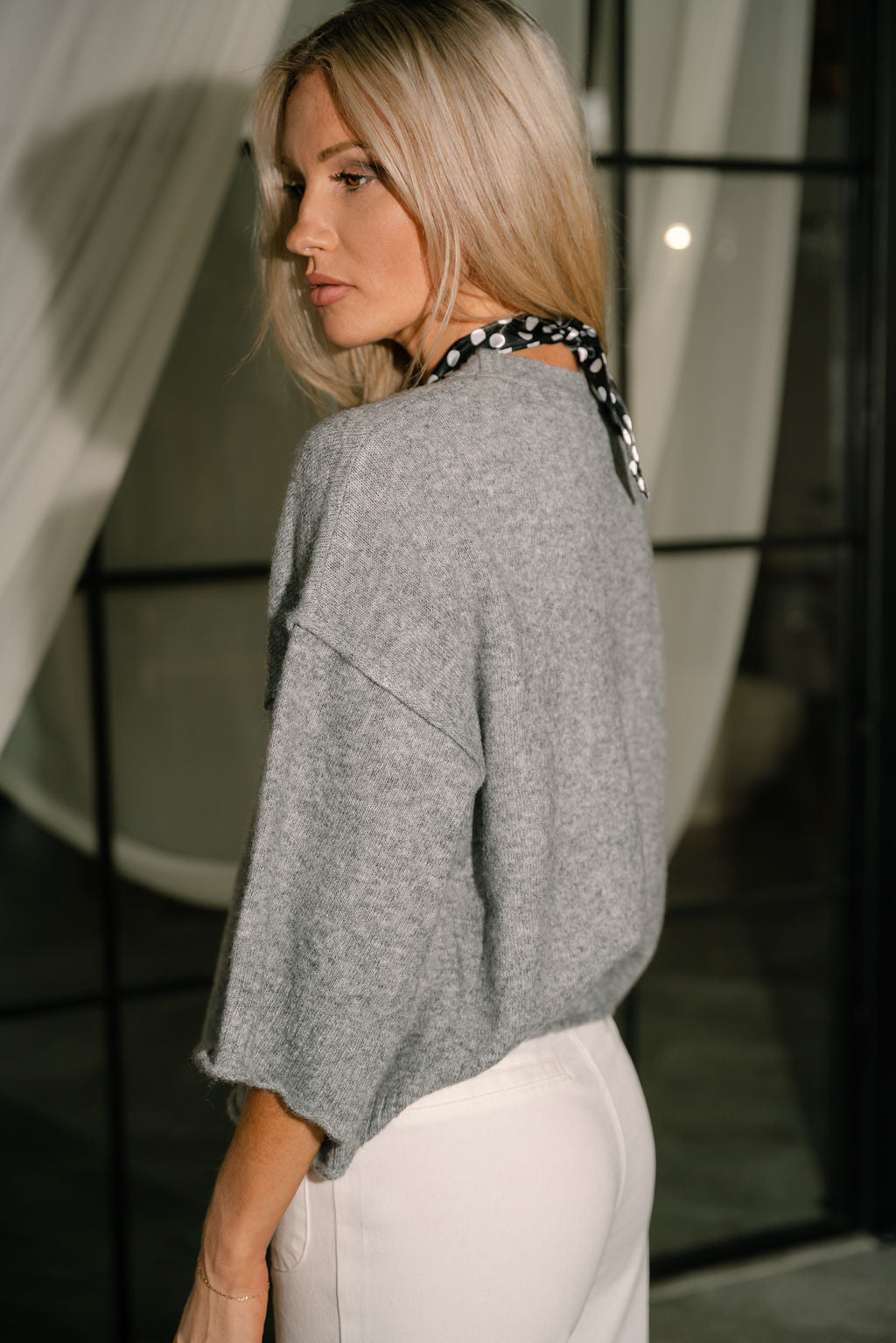 Effortlessly stylish and cozy, the Stella Grey Short Sleeve Knit Sweater is a versatile wardrobe staple. Crafted from soft grey knit fabric, it features a classic round neckline, 3/4 sleeves, and ribbed trim for a polished finish. Subtle raw hem details add a modern, relaxed touch to the silhouette.