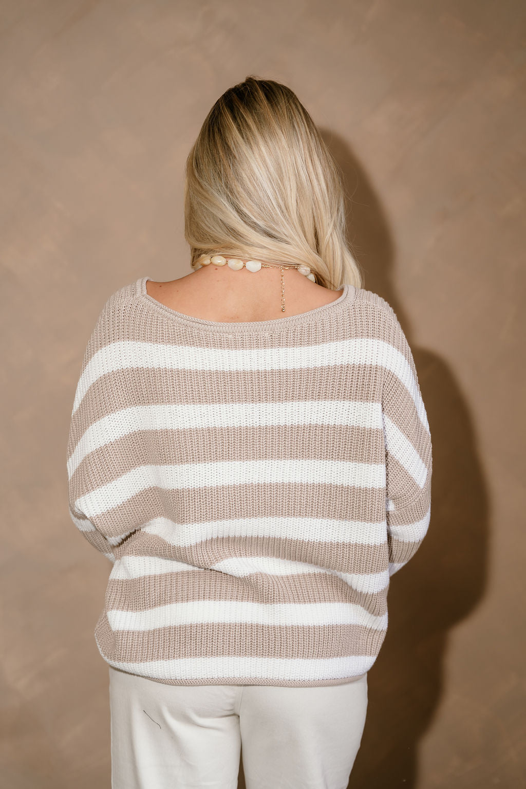 The Steph Taupe & White Striped Sweater is a timeless knit essential with a soft, neutral palette that’s easy to style. Made from taupe and white knit fabric, this sweater features a classic stripe print and a comfortable round neckline for an effortless, everyday look. Its clean design makes it a versatile staple for any wardrobe.