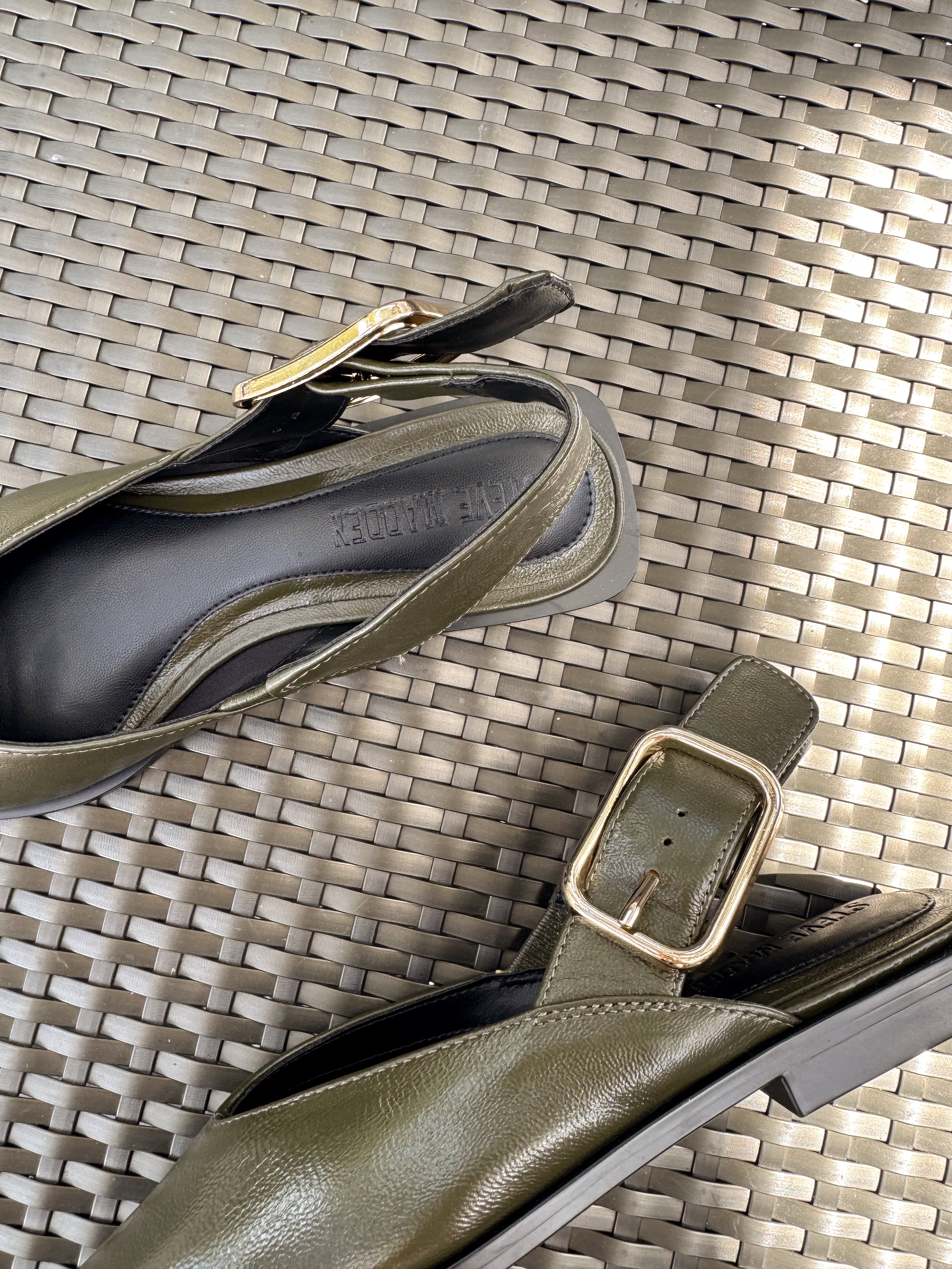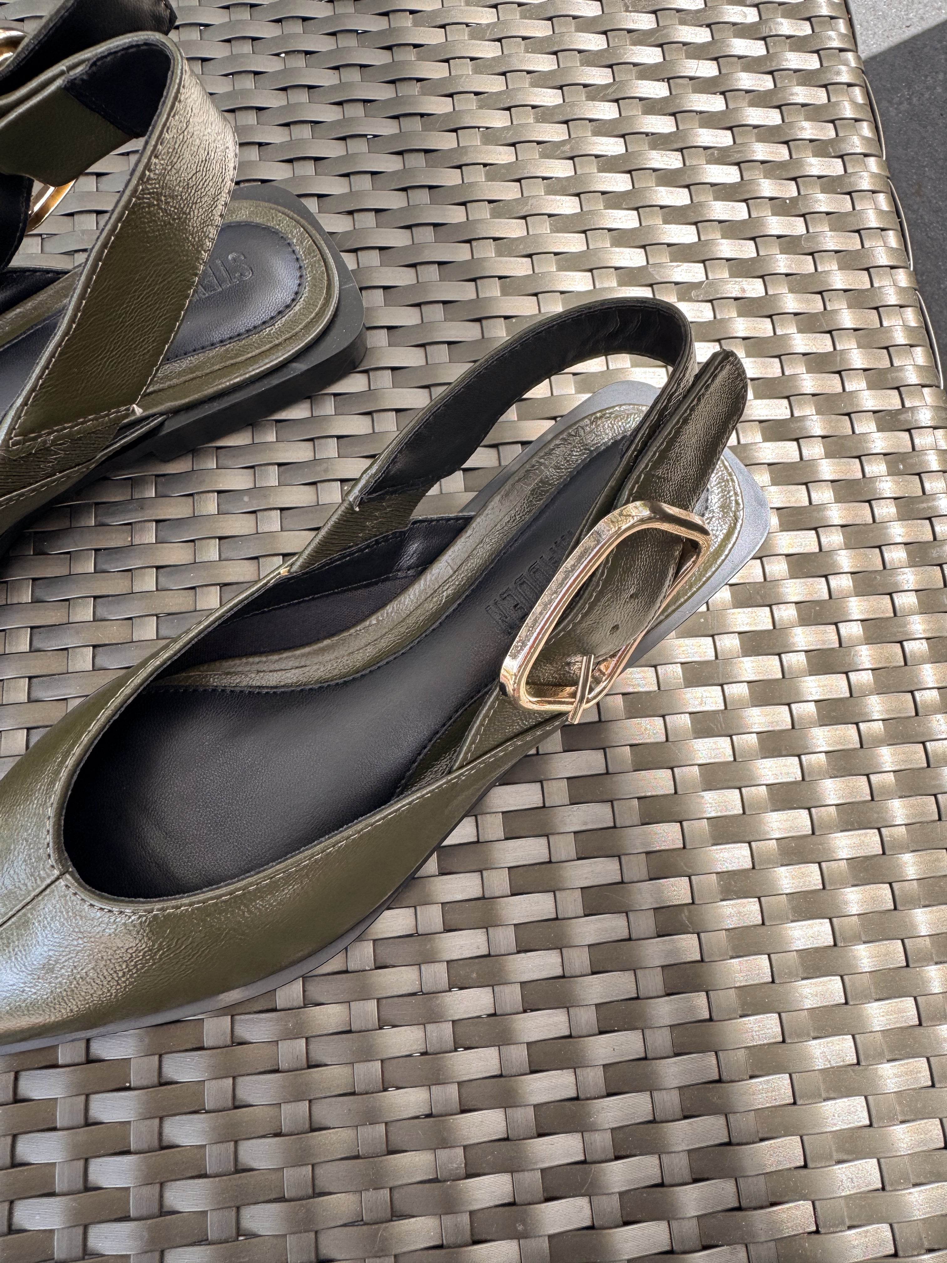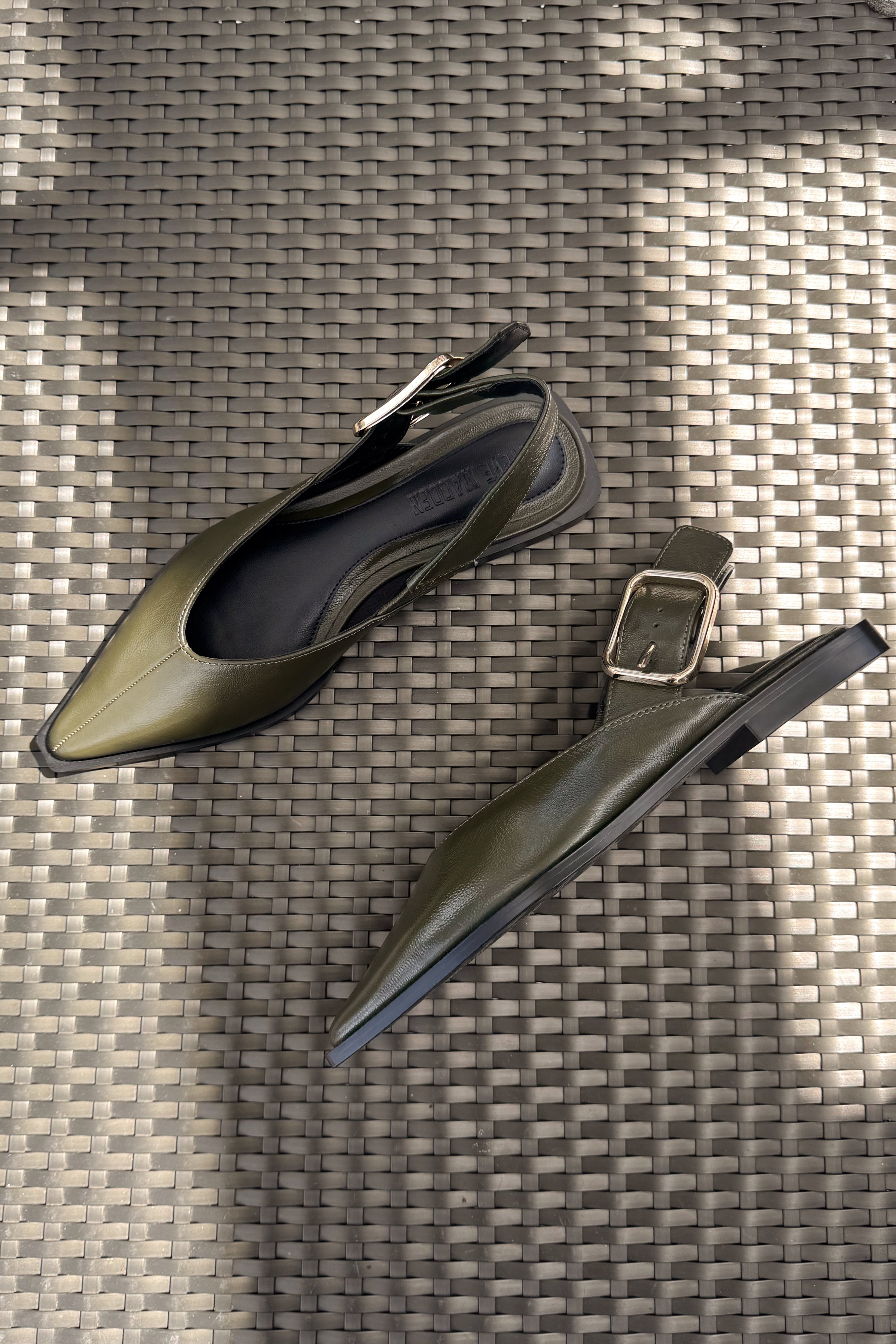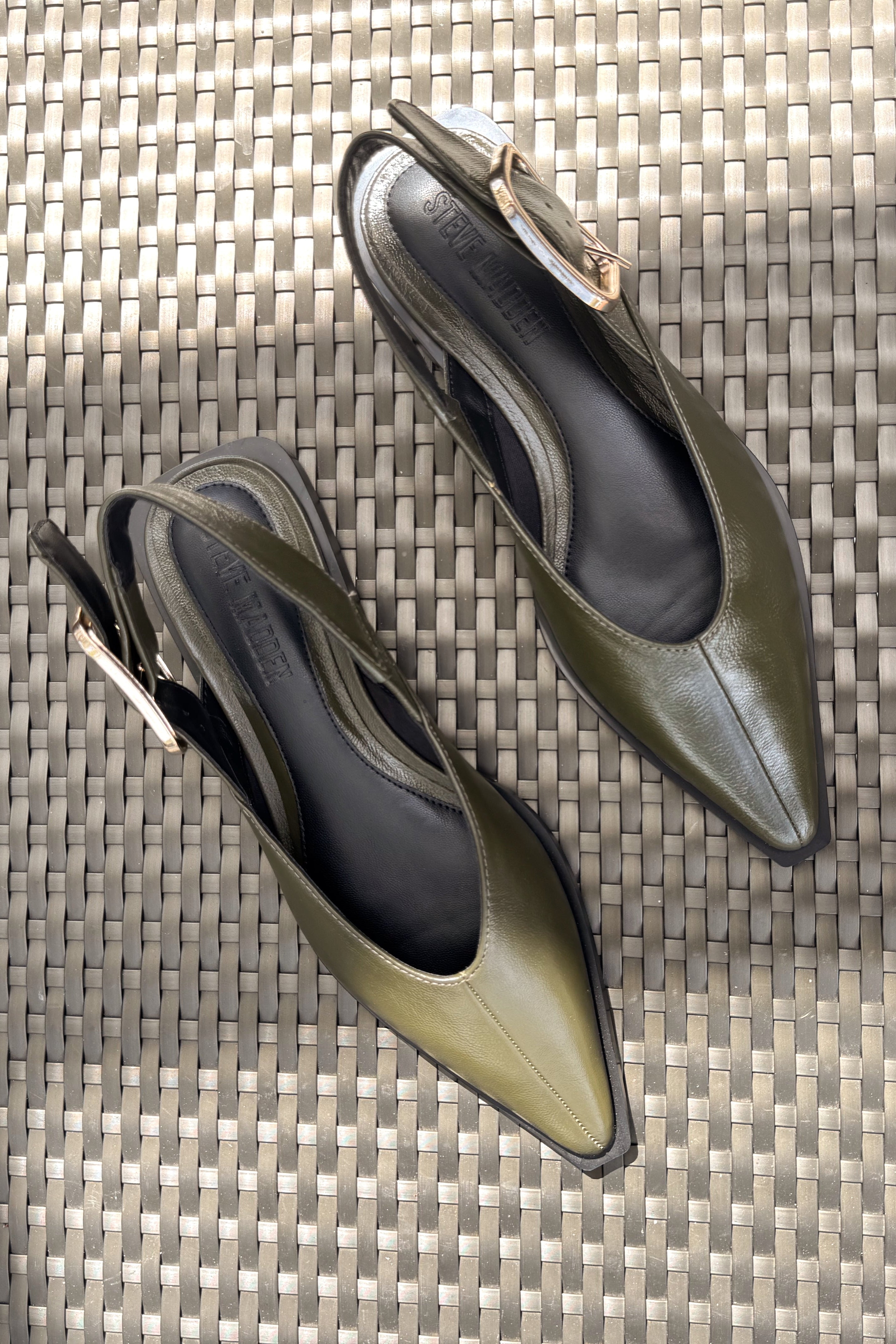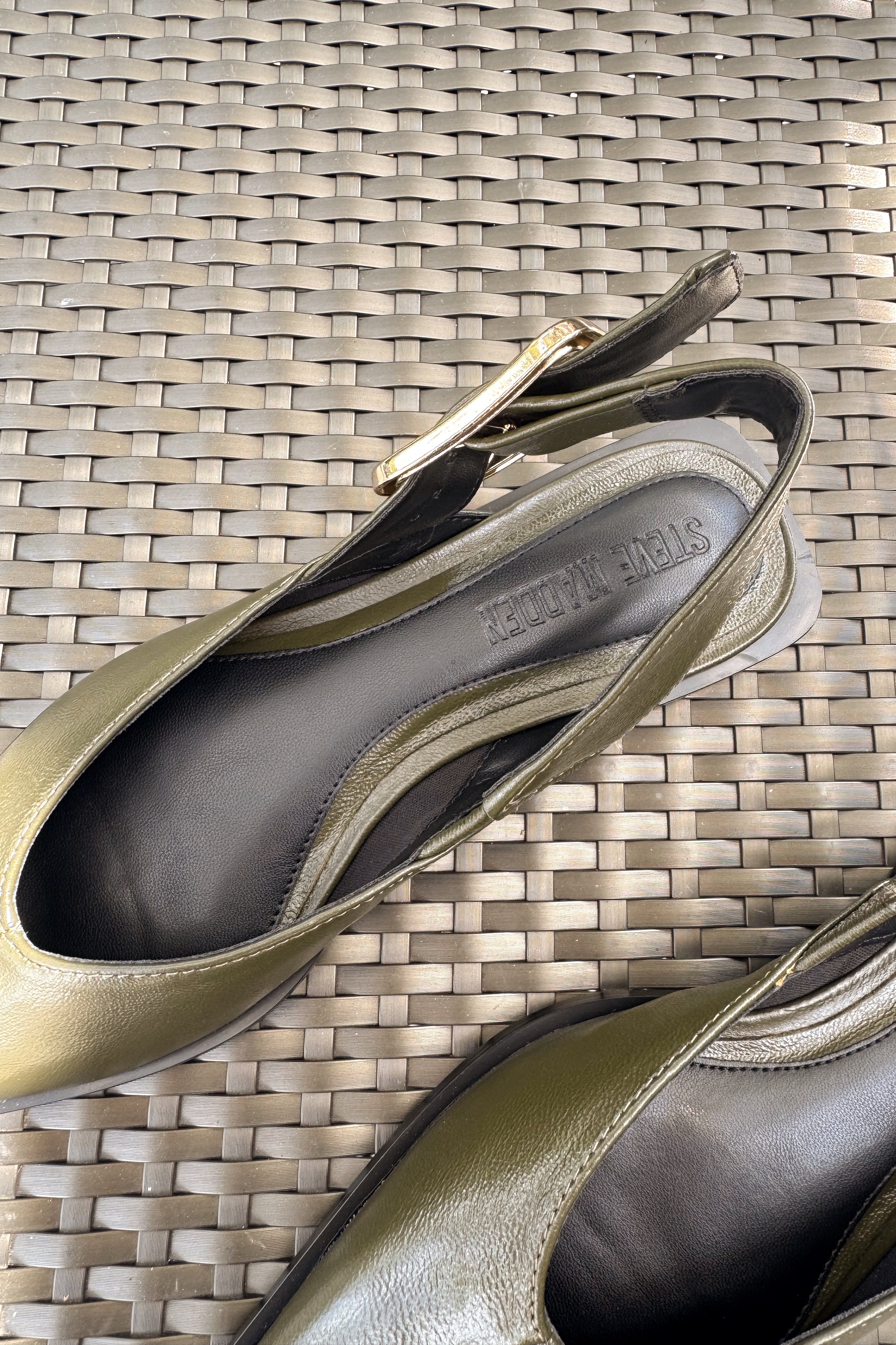 Effortlessly chic, the Steve Madden Shay Olive Slingback Flat brings polish to everyday style. Designed with a smooth olive leather upper and a refined pointed toe, this versatile flat offers a sleek, modern silhouette. The adjustable slingback strap provides a secure fit, while the 0.75-inch heel adds just the right touch of lift. Perfect for pairing with tailored trousers or flowy skirts, the Shay blends comfort and sophistication with ease.