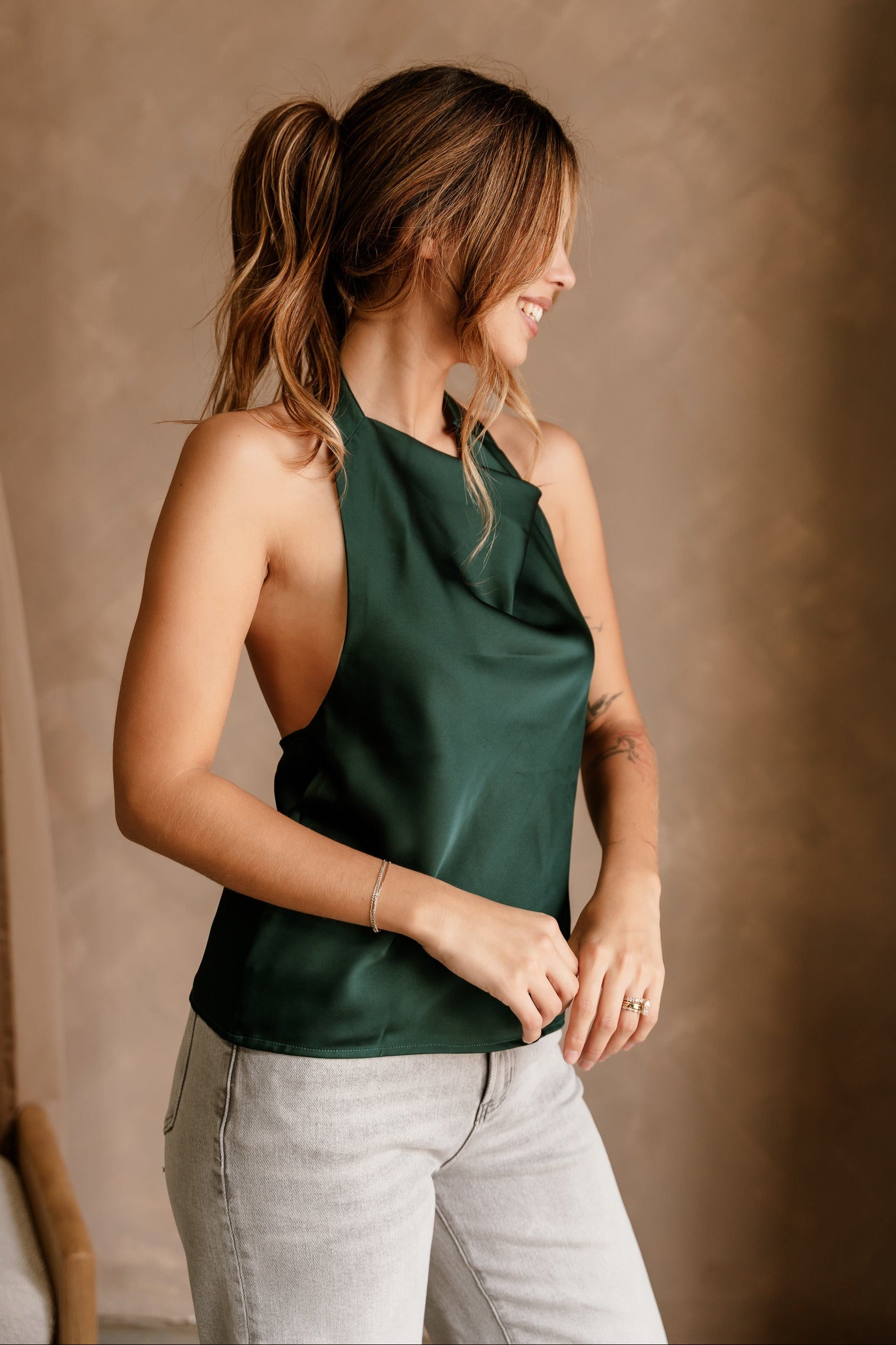 The Stevie Hunter Green Satin Tank brings sleek sophistication to any look. Crafted from lustrous hunter green satin fabric, this top features a chic halter neckline and an alluring open back for a modern, elegant touch. Finished with a secure hook closure, it’s perfect for pairing with tailored pants or skirts for a polished evening ensemble.