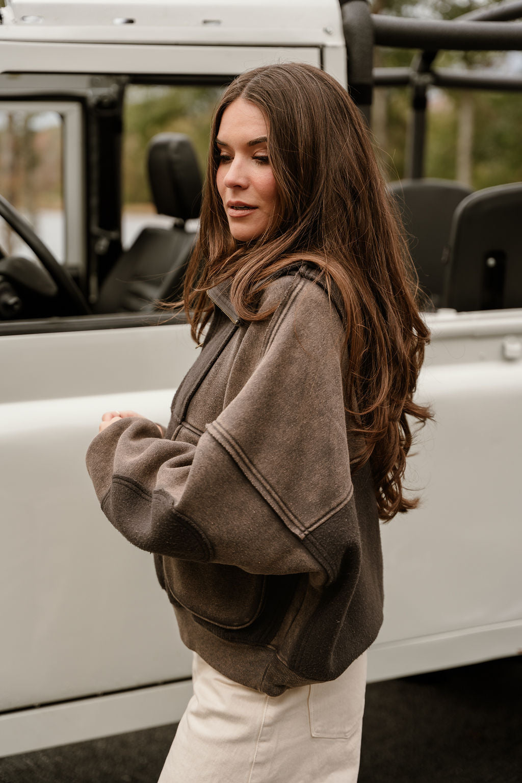 Utility meets effortless cool in the Stevie Washed Charcoal Grey Quarter Zip Pullover. Made from lightweight cotton fabric in a softly washed charcoal finish, this pullover offers a relaxed, lived-in look with just the right amount of structure. The quarter zip and high neckline allow for adjustable coverage — wear it zipped for a polished feel or open for a casual, undone vibe.