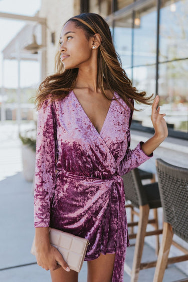 Velvet Romper in Plum brings modern flair and chic style to your evening wardrobe. First, the light purple crushed velvet feels soft and luxurious. Moreover, the surplice neckline creates a flattering, polished silhouette. Additionally, the front skirt overlay with side tie adds playful detail and movement. Therefore, this romper works perfectly for parties, dinners, or special occasions. Overall, it combines comfort, style, and charm effortlessly.
