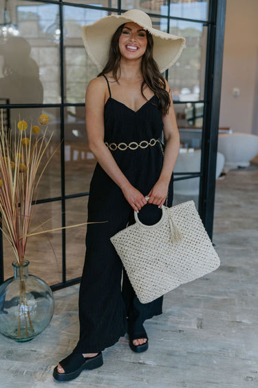 Get ready to turn heads in The Sweet Escape Black Jumpsuit, a must-have piece that blends ease and elegance. Although minimal in design, it still makes a bold statement. Made from black plissé fabric, it adds texture and shine without feeling heavy.