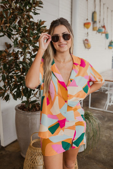 The Sweet Escape Skirt features a light orange, fuchsia, green, light blue and cream geometric pattern, a pink lining, a mini-length hem, a small side slit, and a side zipper and hook closure.