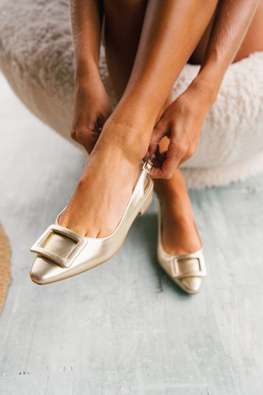 The Sweetie Gold Slingback Flats are the perfect blend of sophistication and practicality. Crafted from metallic gold material, these flats instantly add a touch of glamour to any outfit. Additionally, the pointed toe creates an elegant silhouette, while the square buckle detail enhances the design with a refined finish. Whether dressing up or down, these flats offer effortless style.