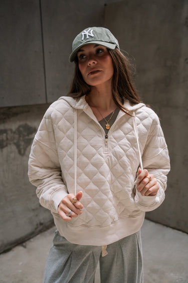 The Sylvie Bone Quilt Quarter Zip-Up Jacket blends comfort and sophistication with its lightweight bone-colored fabric and unique scallop wavy quilted pattern. Designed with a relaxed fit, it features a ribbed hem and dropped shoulders for a laid-back vibe. The quarter zip-up closure with adjustable ties adds versatility, while the attached hoodie provides extra coziness. Long sleeves complete the look, making it perfect for layering during cooler days. Whether paired with jeans or joggers, the Sylvie jacket is a stylish staple for any casual wardrobe.