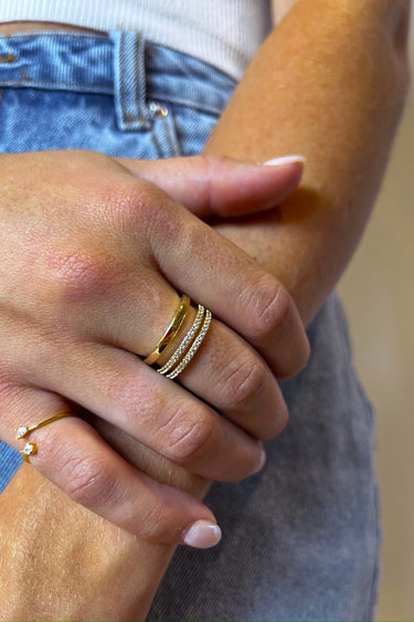 The Triple Threat Ring features features three-layered gold ring bands with clear stones.