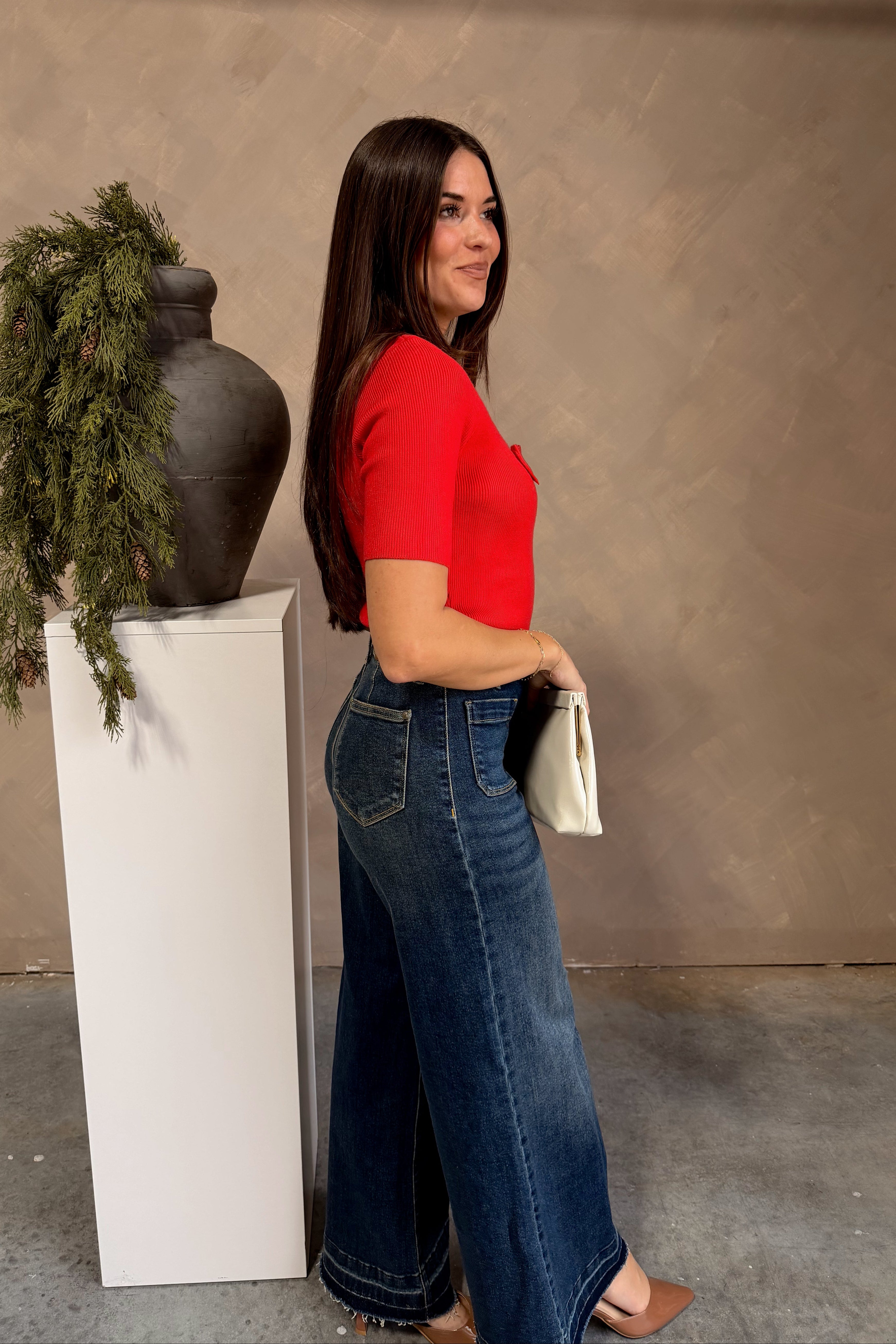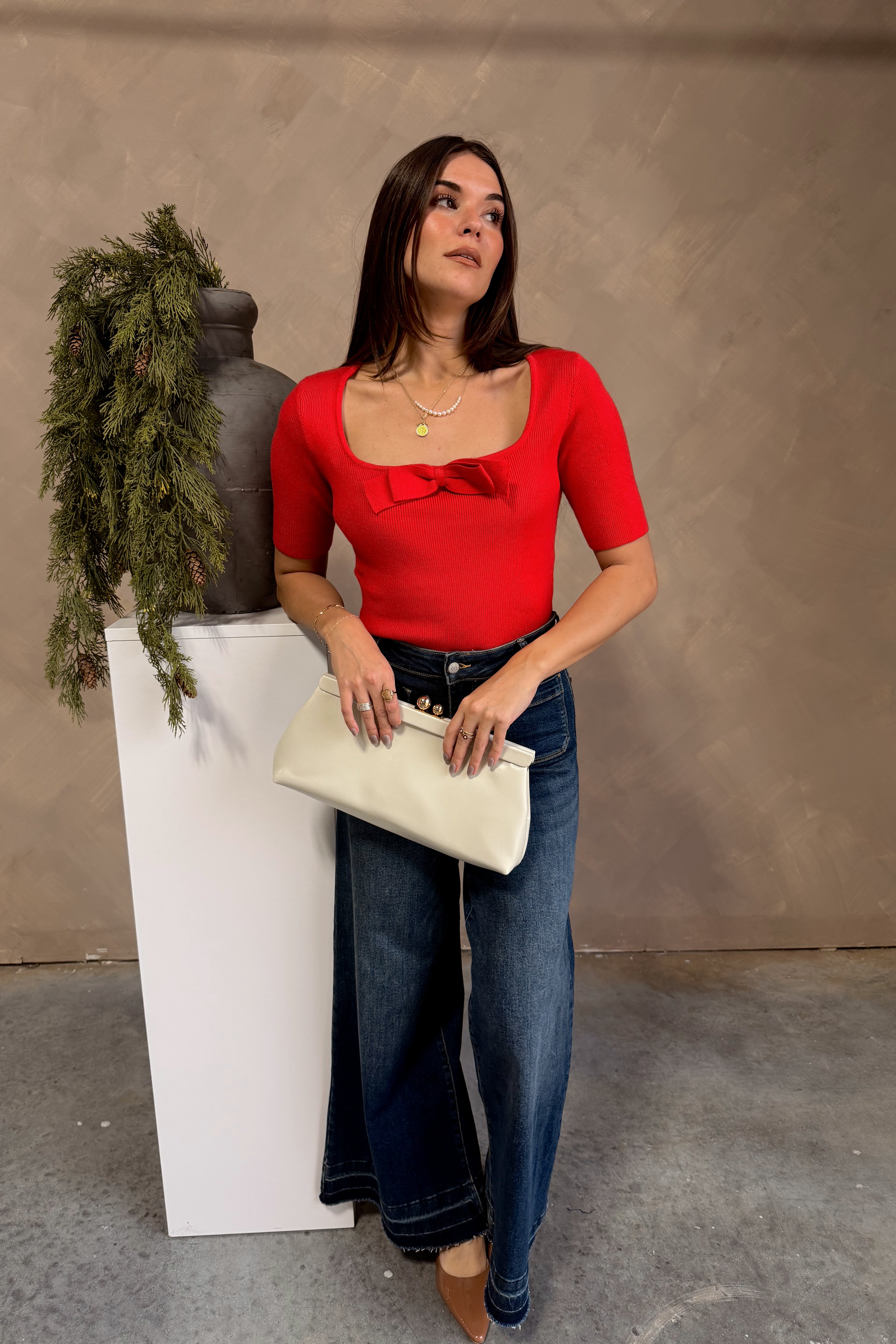 The Tristan Red Square Neck Bow Top adds a sweet and stylish pop of color to your wardrobe. Made with soft red ribbed knit fabric, this fitted top offers a flattering stretch and a comfortable feel you can wear from day to night. The bold red shade makes it perfect for holiday parties, date nights, or simply elevating your everyday look.