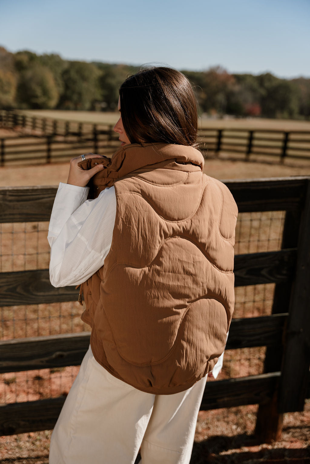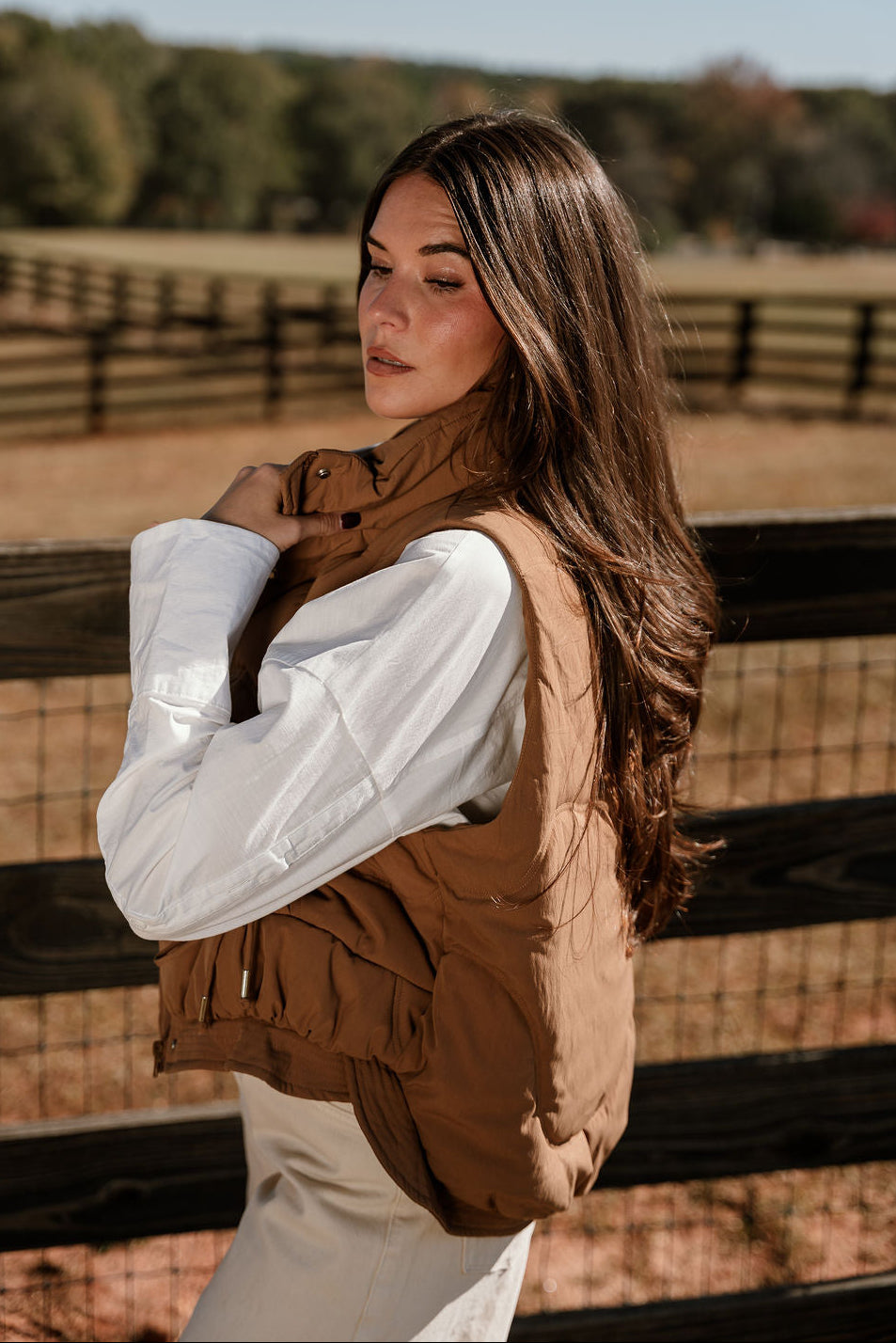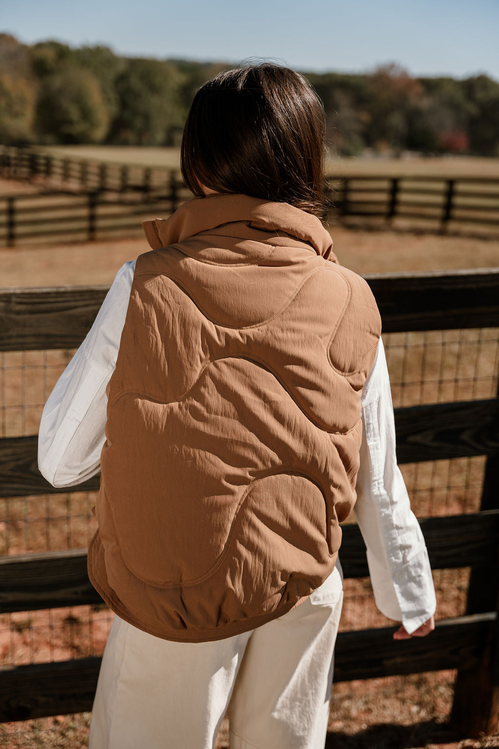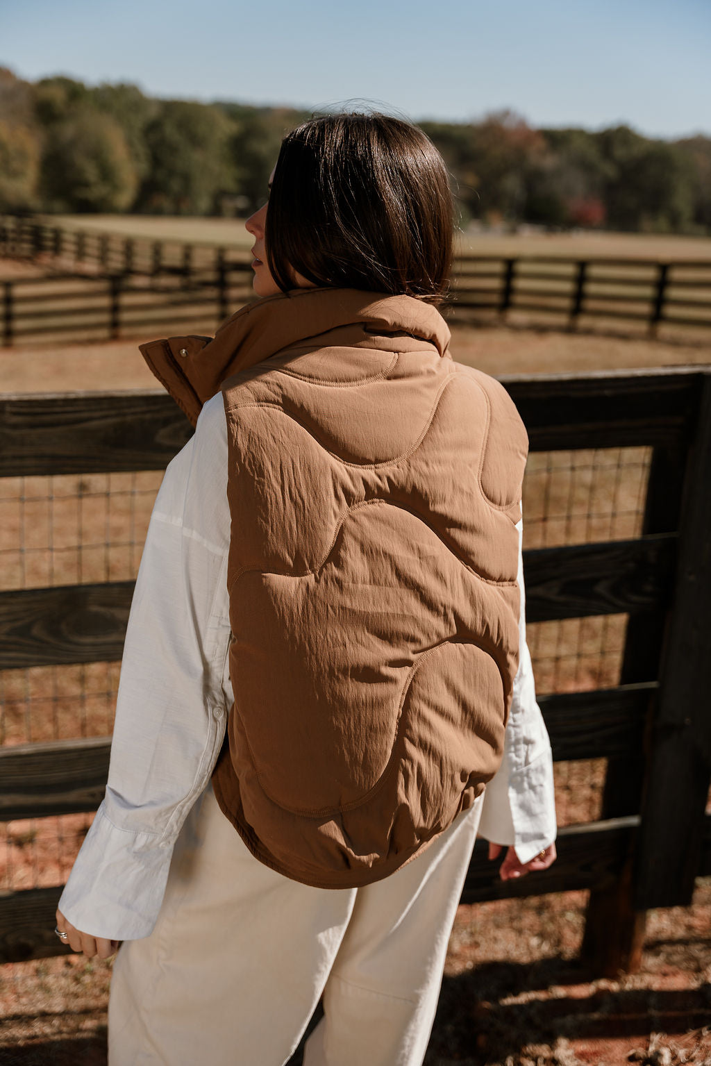 Stay warm and stylish with the Vera Brown Puffer Zip-Up Vest — a versatile layering piece designed for both comfort and impact. Crafted from rich brown puffer fabric with a subtle monochrome wavy pattern, this sleeveless vest adds texture and dimension to any outfit.
