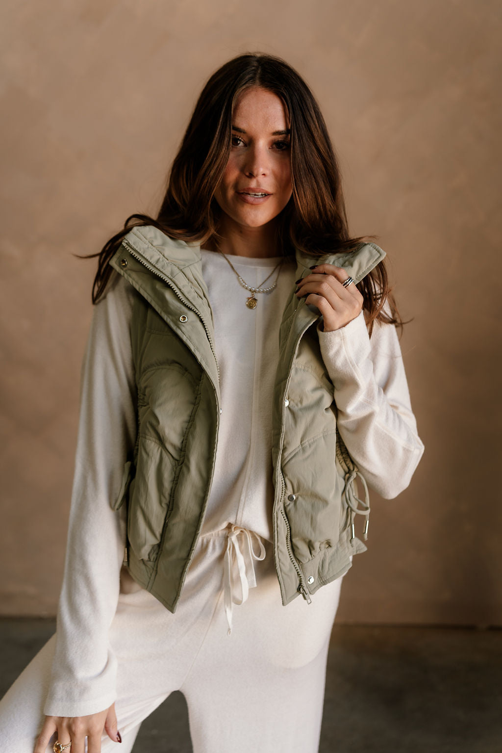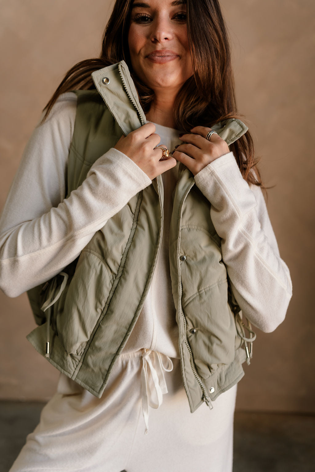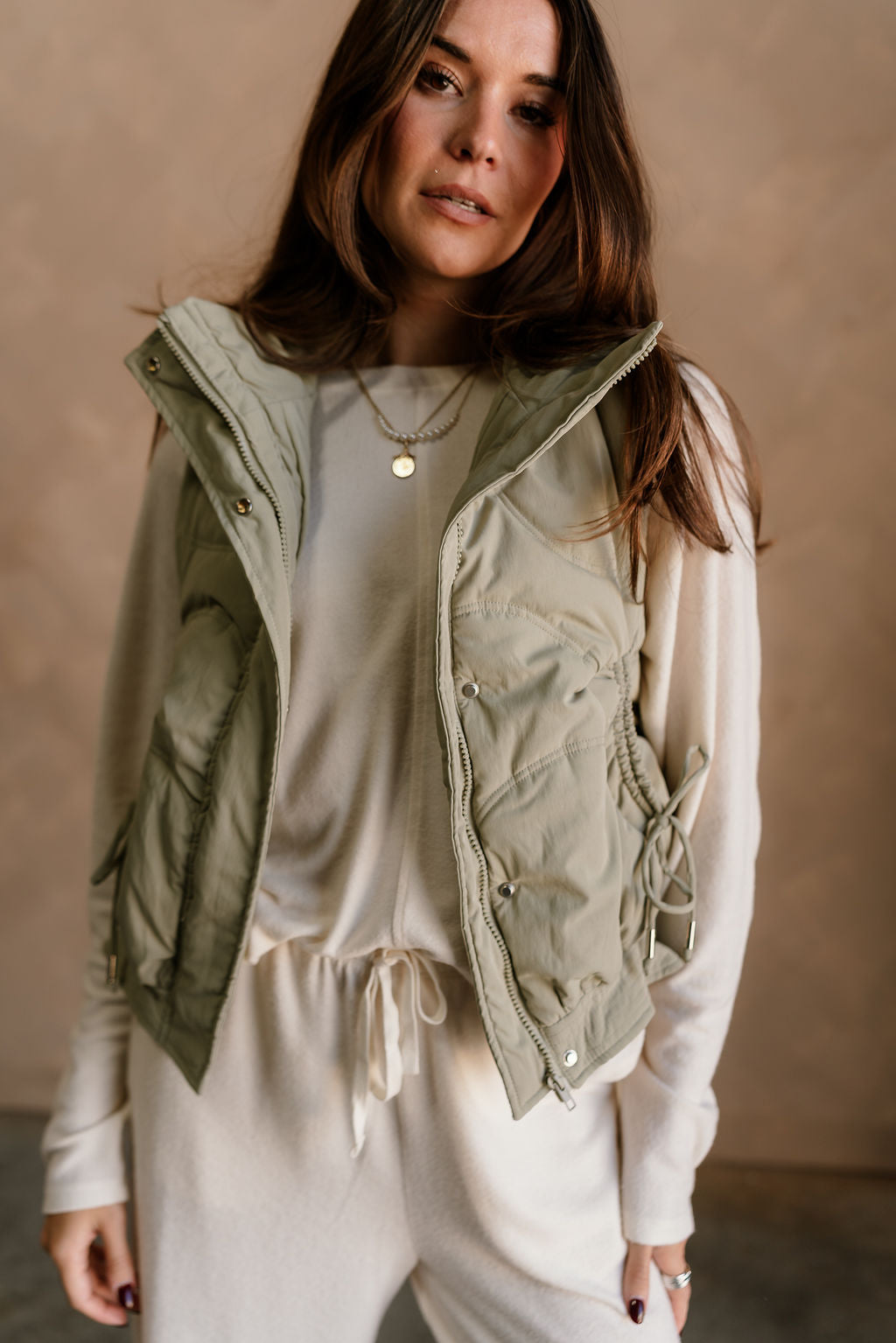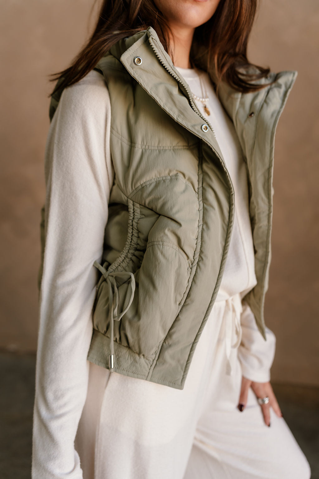 Featuring a high neckline and front monochrome zip-up with snap closure, it provides a cozy, streamlined fit. Drawstring tie details allow for an adjustable silhouette, while front pockets offer practical storage and added style. The matching dusty sage lining ensures smooth, comfortable layering over tops or sweaters.