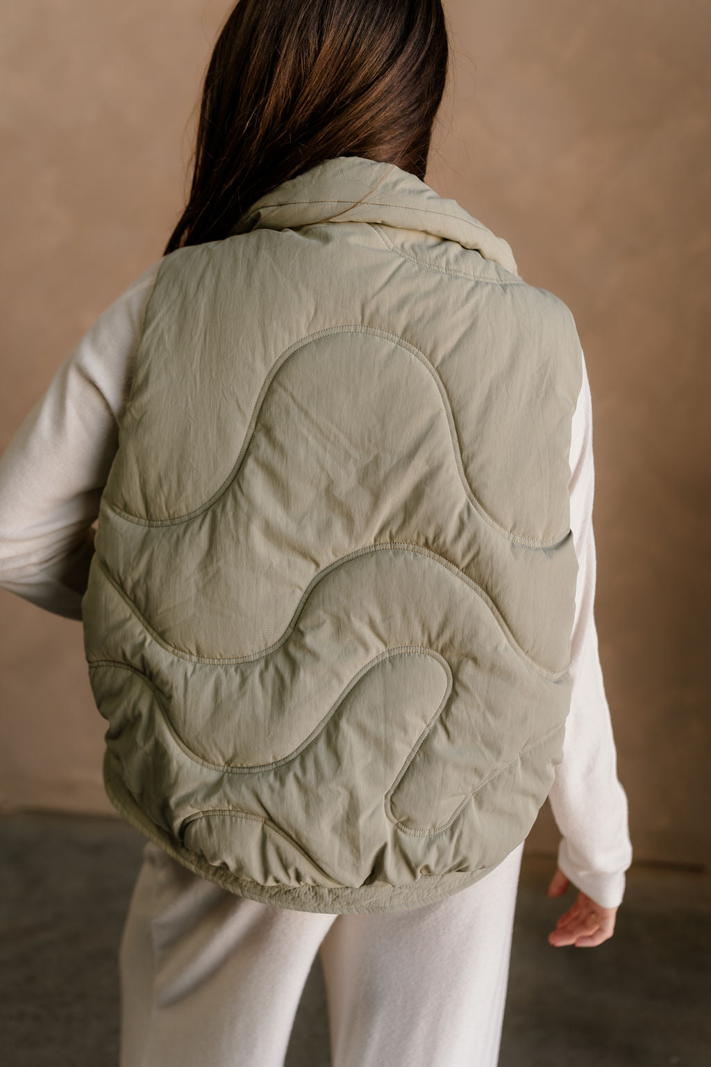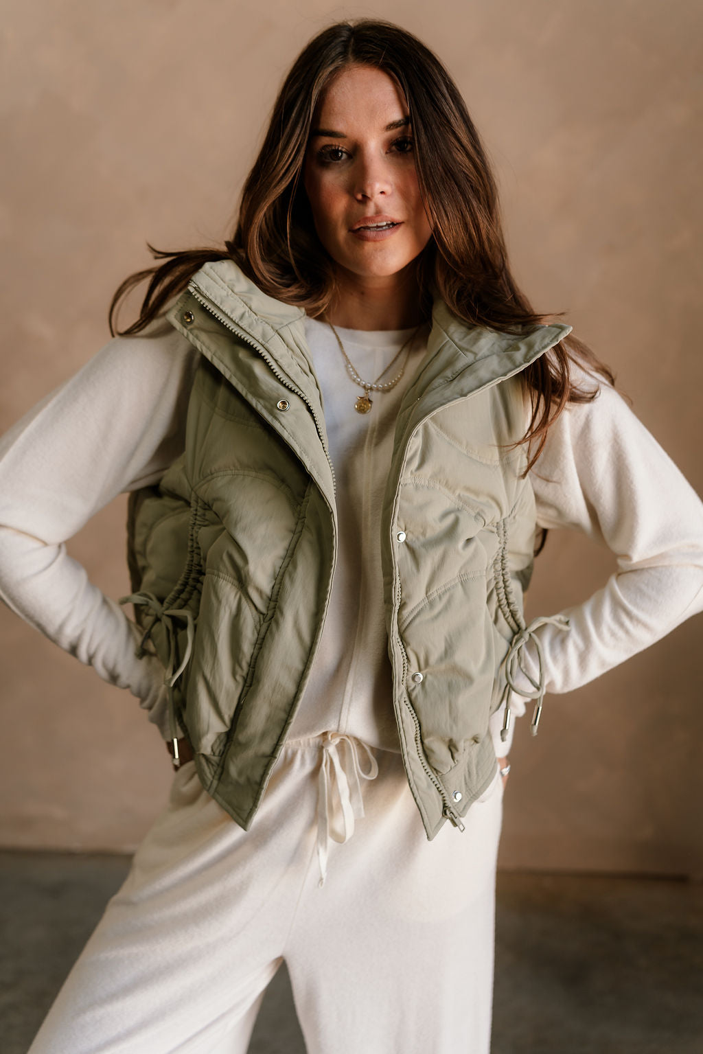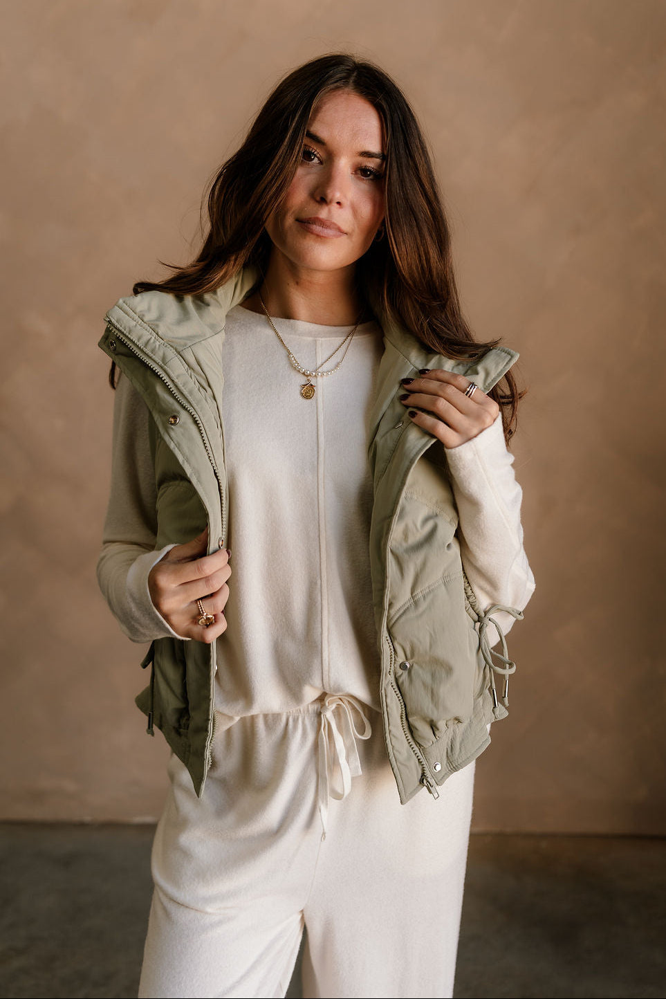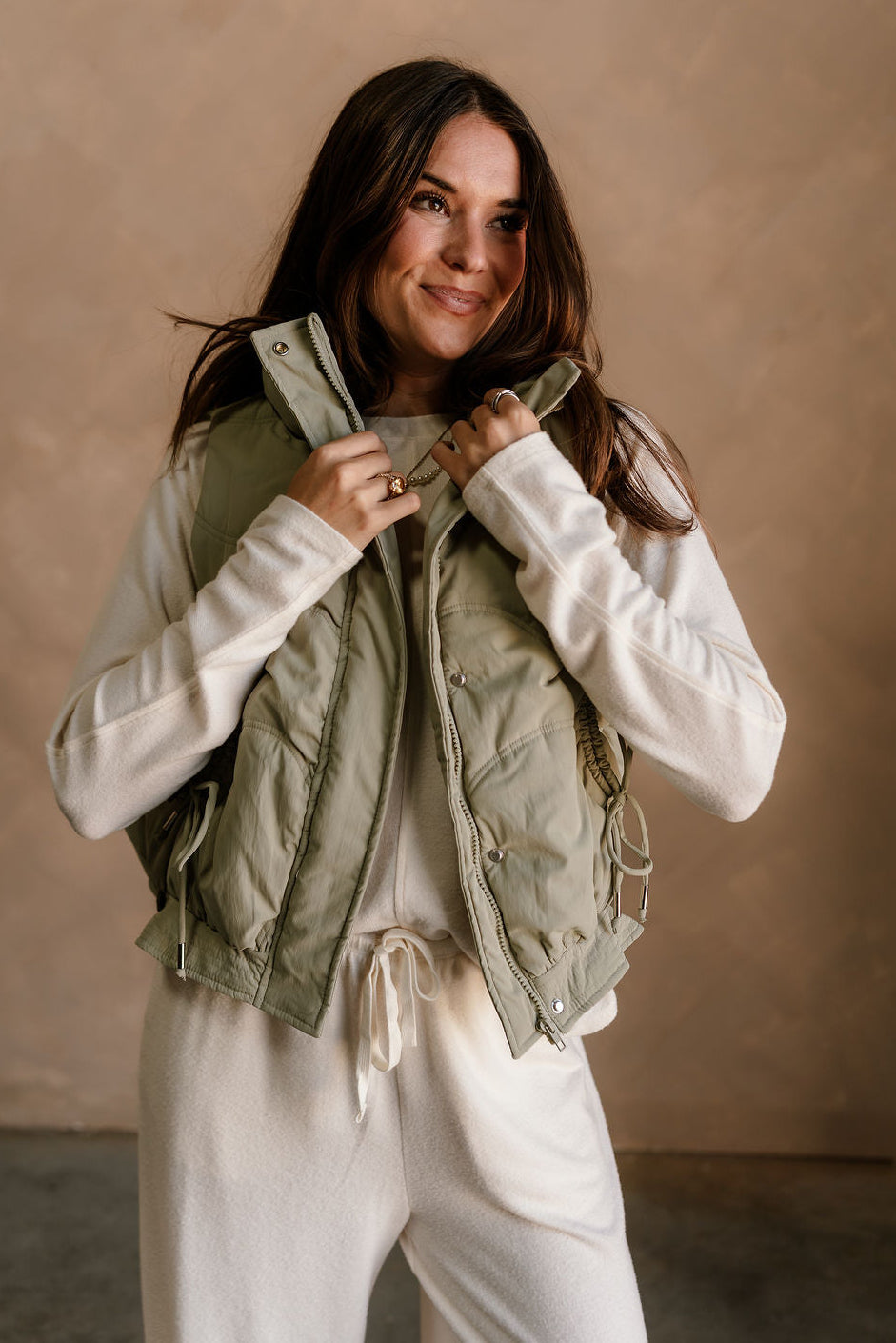 Featuring a high neckline and front monochrome zip-up with snap closure, it provides a cozy, streamlined fit. Drawstring tie details allow for an adjustable silhouette, while front pockets offer practical storage and added style. The matching dusty sage lining ensures smooth, comfortable layering over tops or sweaters.
