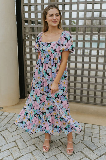 Elevate your wardrobe with the Multi-Colored Puff Midi Dress, perfect for embracing floral elegance all year round.