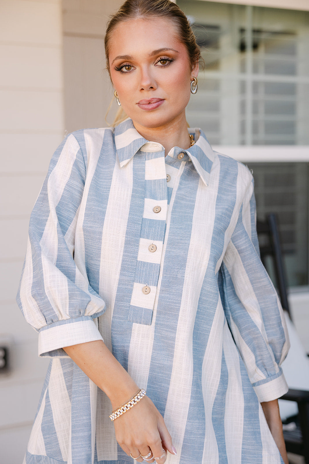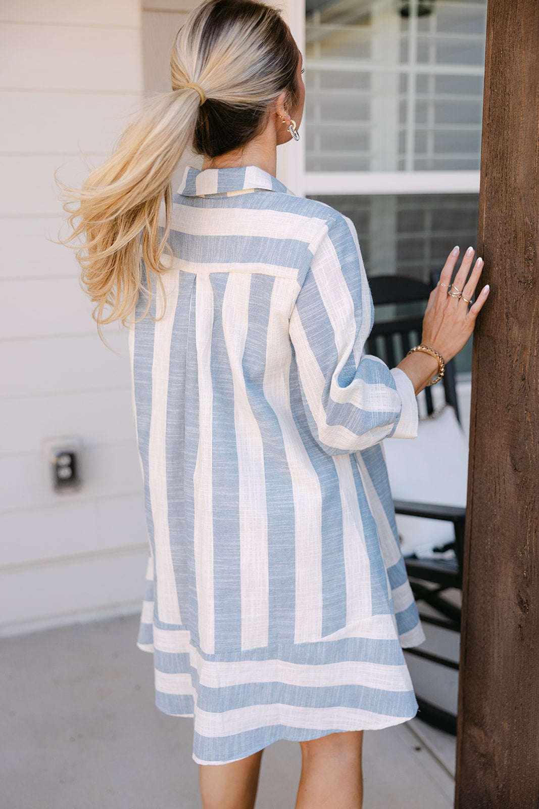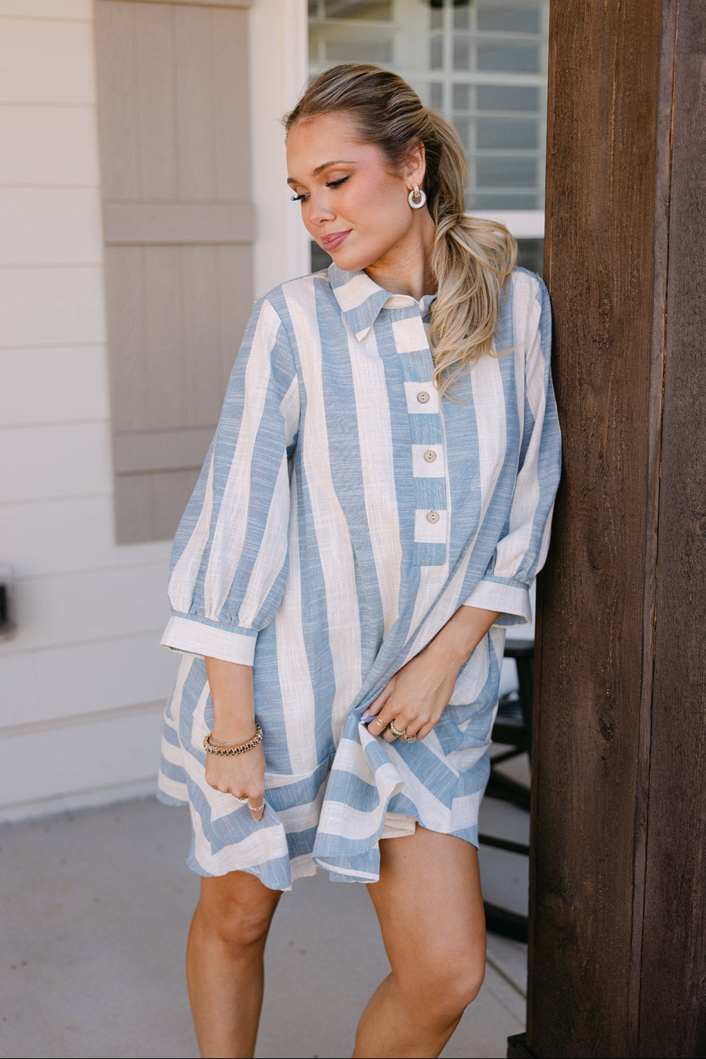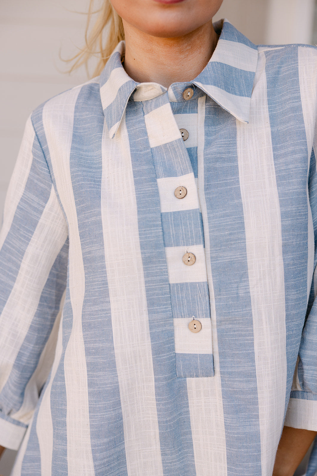 Willa Oatmeal & Dusty Blue Linen Stripe Mini Dress