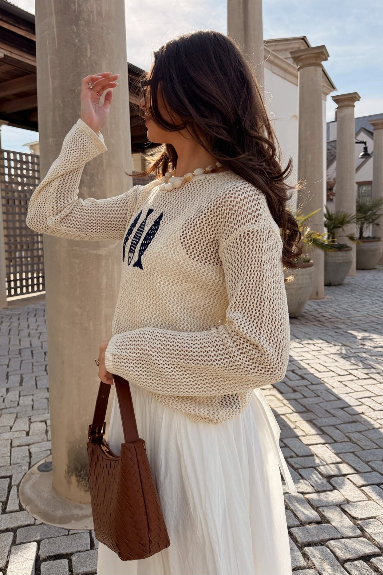 A bold navy stitch fish graphic adds a unique, eye-catching detail, giving this sweater a fun yet elevated coastal-inspired vibe. Designed with a classic round neckline and long sleeves, it delivers a timeless silhouette that’s easy to wear and endlessly versatile. The comfortable fit makes it ideal for relaxed days while still feeling thoughtfully styled.