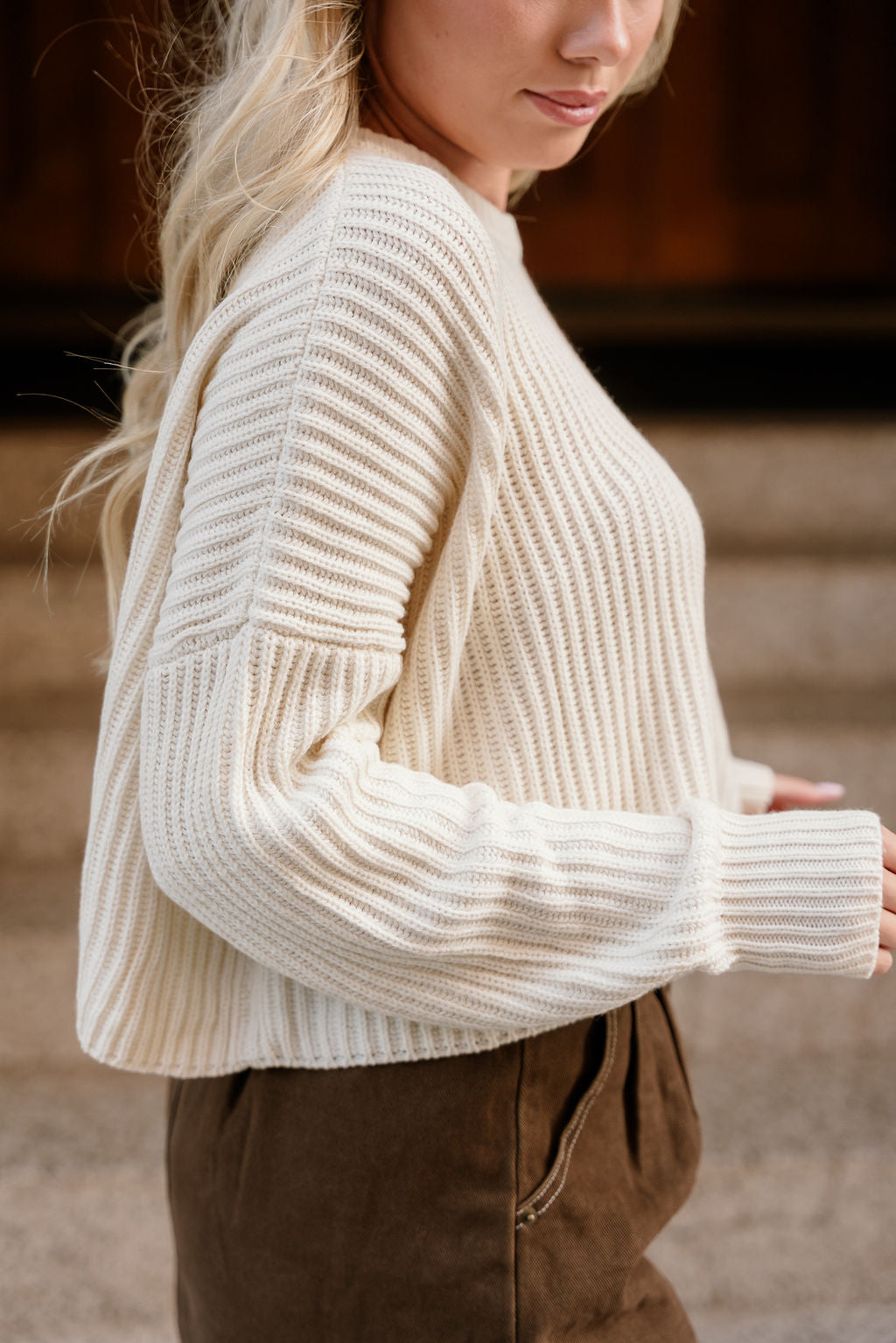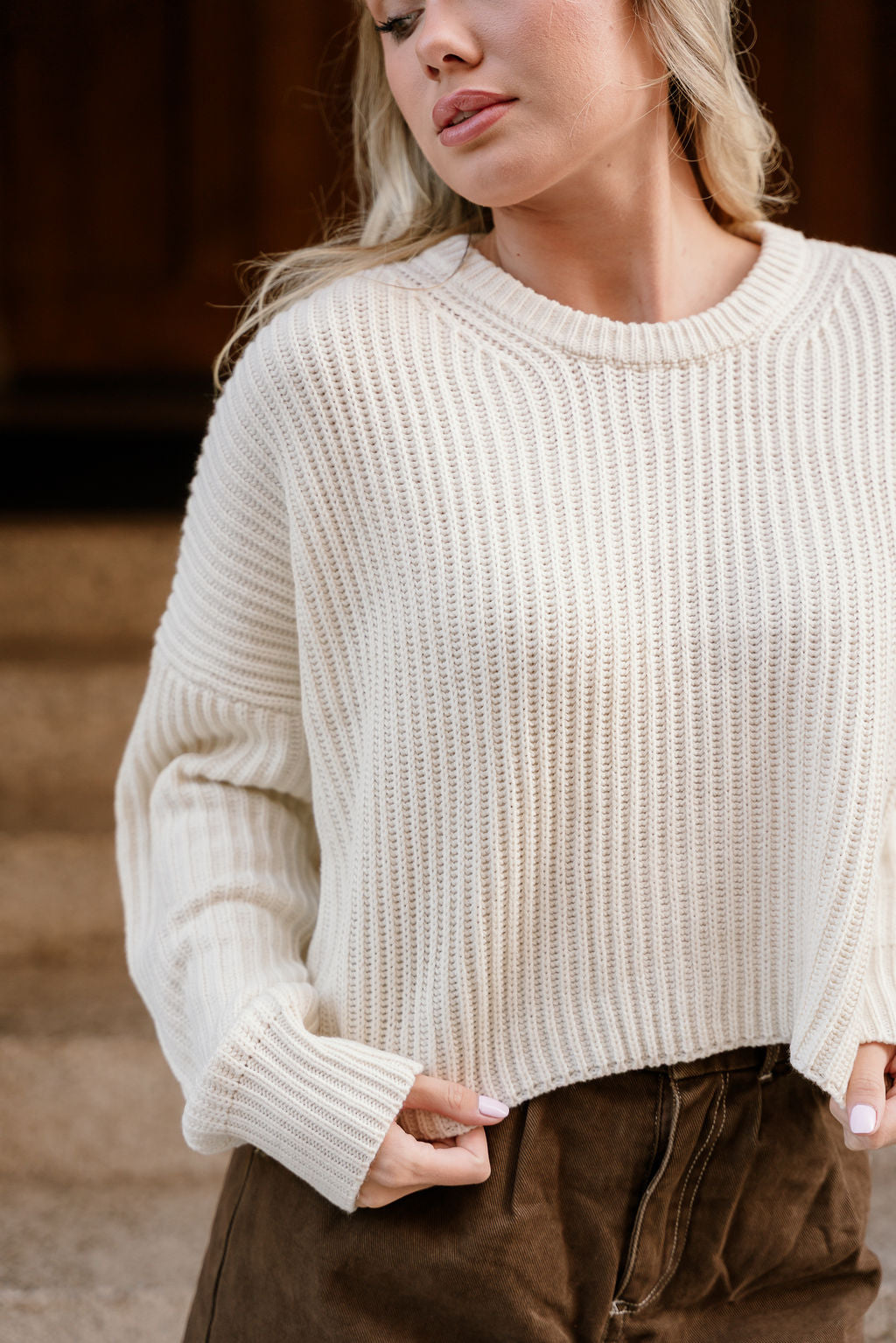 The Wren Cream Knit Long Sleeve Sweater is a timeless essential with a modern twist. Crafted from soft cream cable knit fabric, this cozy piece features a round neckline, dropped shoulders, and a cropped waist for a relaxed yet flattering fit. The long sleeves and textured knit design add classic charm, making it perfect for pairing with high-waisted jeans or skirts for an effortlessly chic look.
