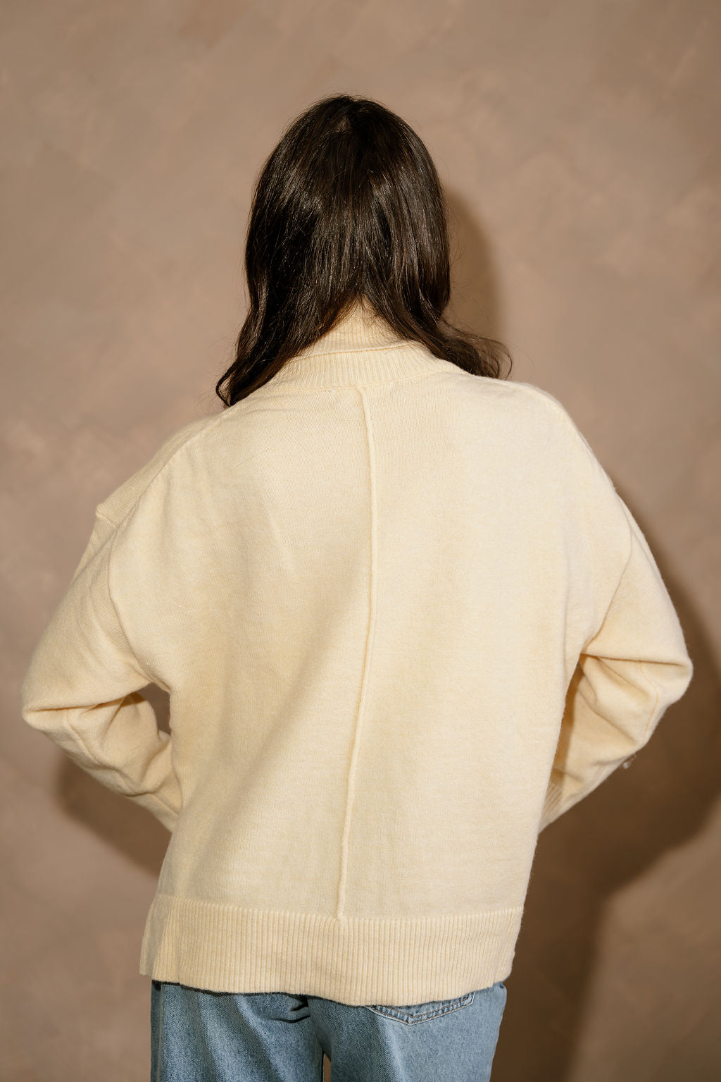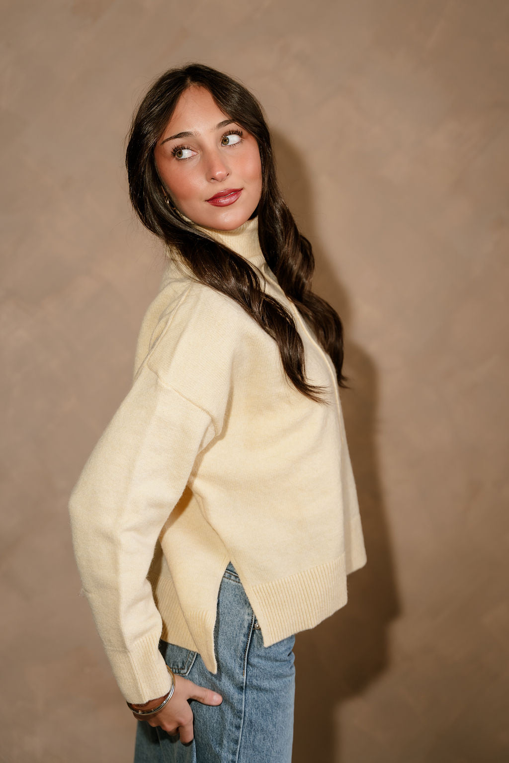 The Wren Light Yellow Knit Sweater brings effortless warmth and modern style to your everyday wardrobe. Made from a soft light yellow knit fabric, this sweater features a cozy turtleneck neckline and relaxed dropped shoulders for an easy, laid-back fit. Long sleeves provide added comfort, while the ribbed hem and side slits enhance movement and create a flattering silhouette. Perfect for layering or wearing on its own, the Wren sweater pairs beautifully with denim or tailored bottoms for a chic, polished look.