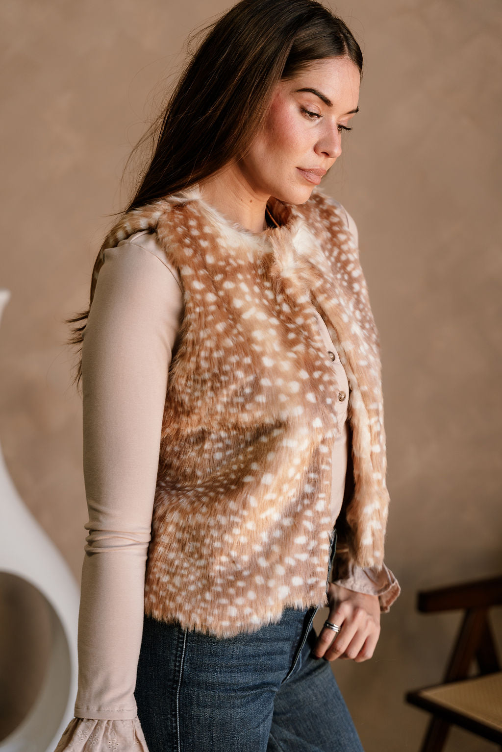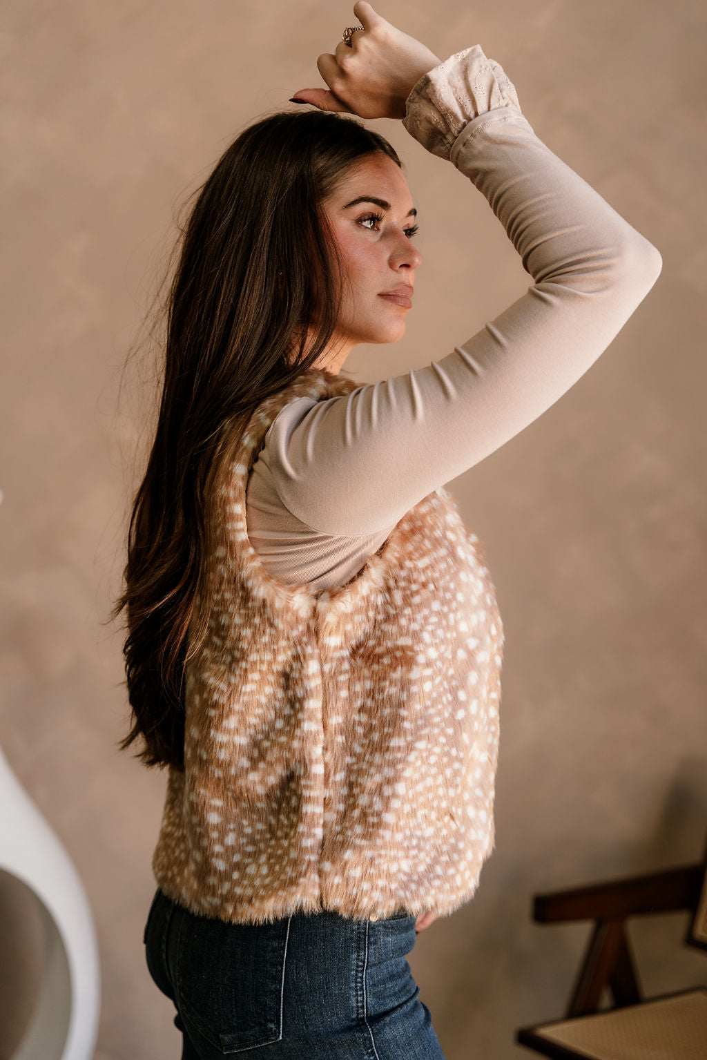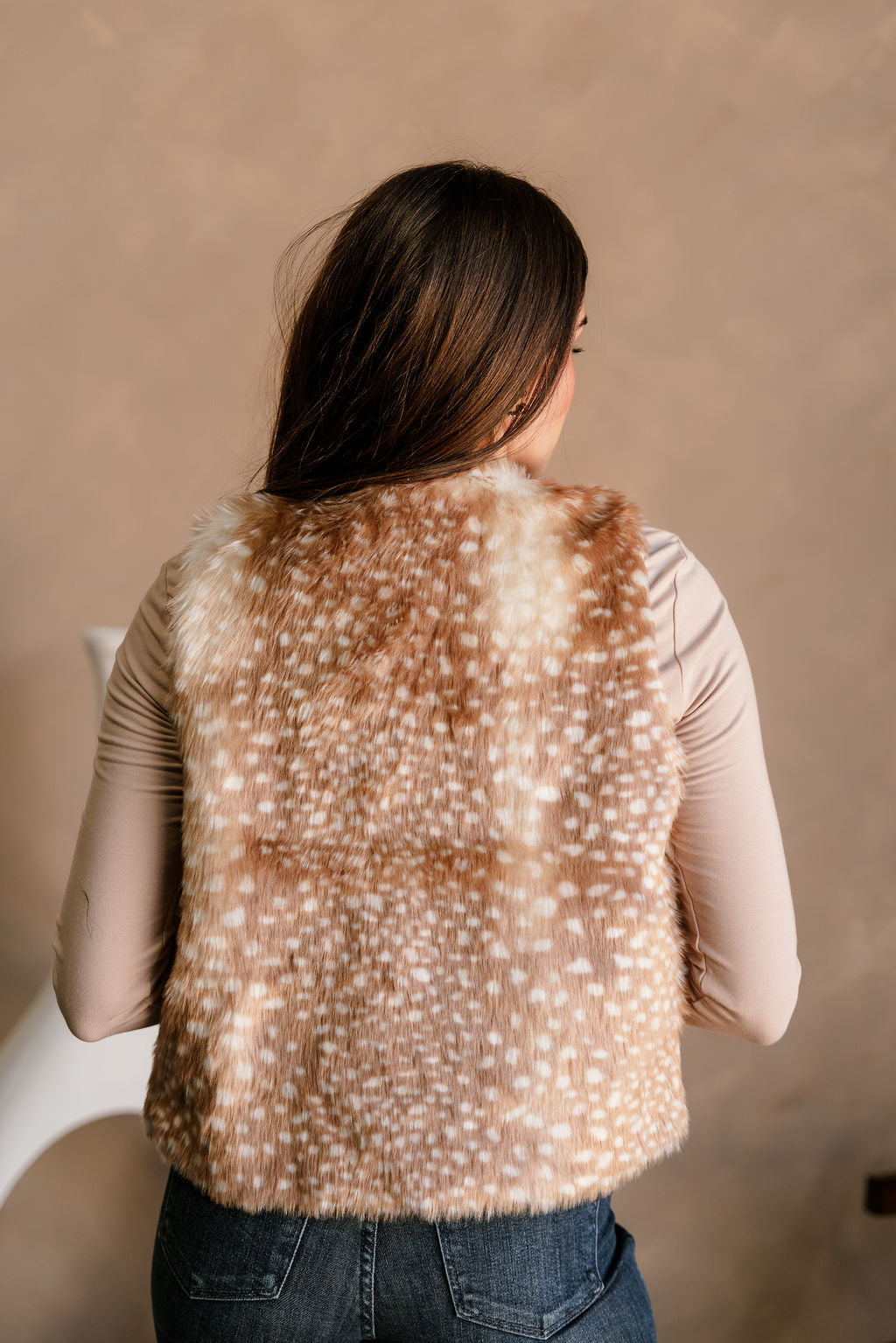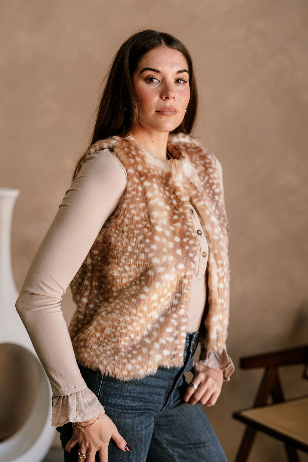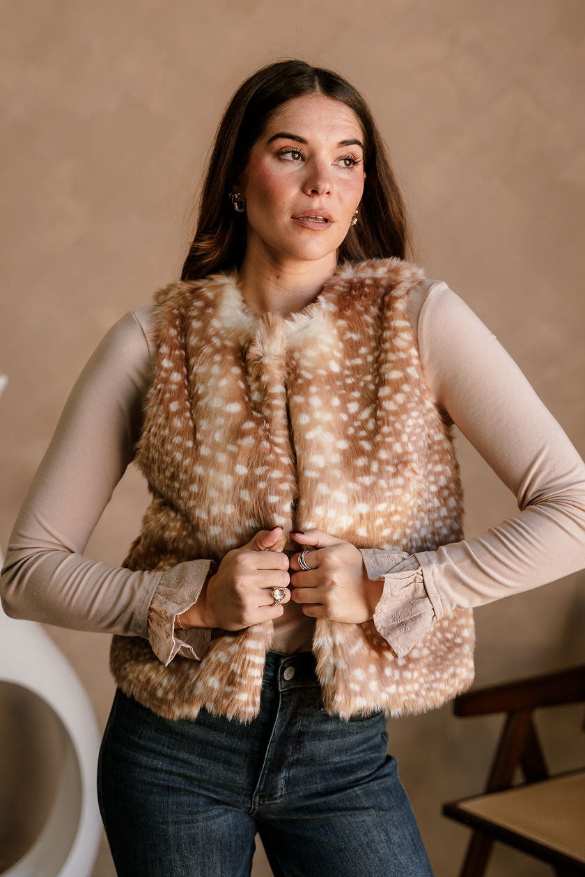 The Zoey Brown Faux Fawn Fur Vest adds a cozy, statement-making layer to your fall and winter outfits. Made from ultra-soft brown, taupe, and white faux fur, this vest features a subtle fawn deer print that brings texture and charm to any look. The round neckline and front hook closures keep the silhouette sleek and easy to style. The sleeveless design makes it perfect for layering over sweaters, blouses, or long-sleeve tops.